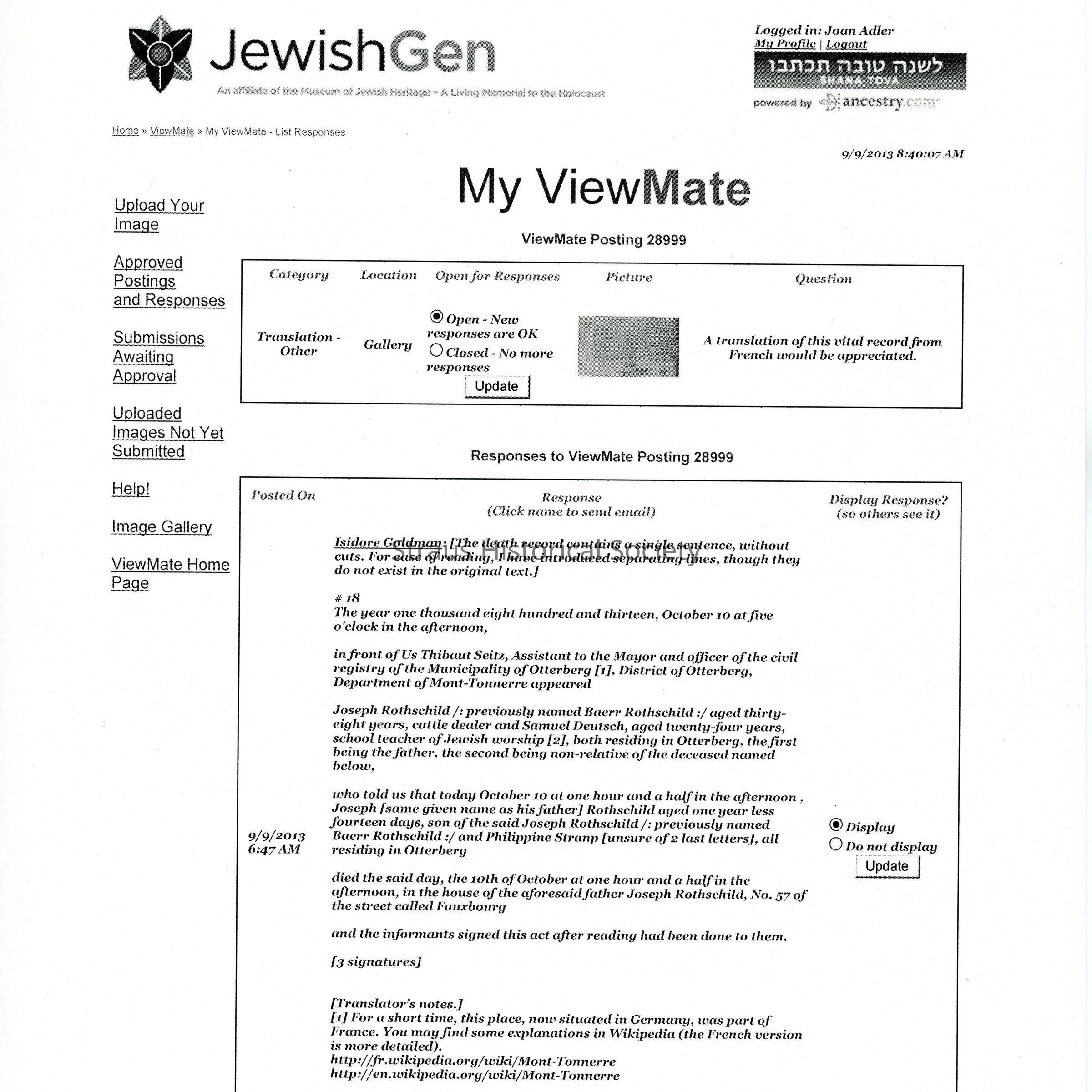 Death certificate for Joesph Rothschild, son of Joesph Rothschild, previously known as Baer Rothschild and Philippe Rothschild nee Straus previously known as Zerle Straus Rothschild. Oct. 10, 1832 in Otterberg, Germany.