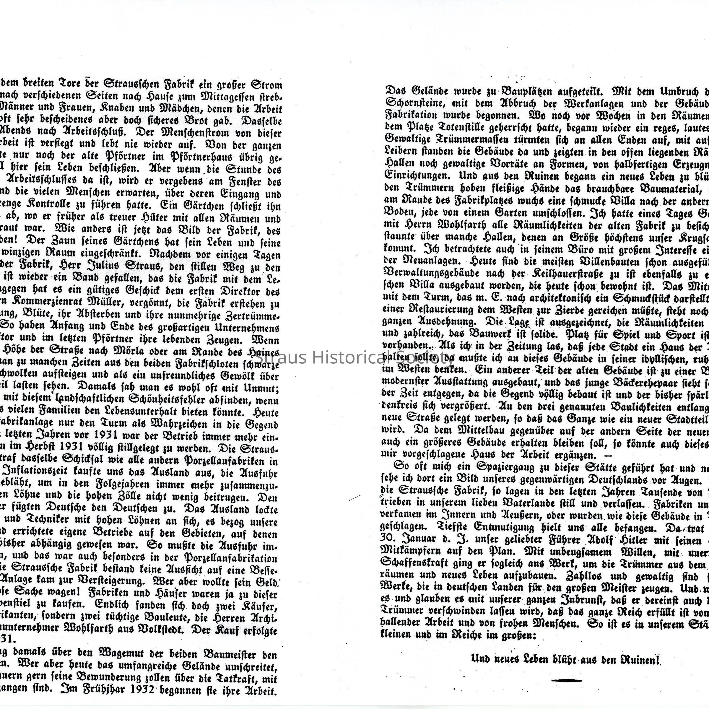 Article is about the history of the china factory in Rudolstadt from its establishment in 1882 until the end of its operation in 1931 and its demolition to make room for a residential complex. The title refers to the last few paragraphs where the author praises the building of residences at the site and the economic recovery in general, which he attributes to Hitler. People mentioned are Nathan Straus as the founder, Julius Straus as the last director and Muller (given name not mentioned), as general manager of the plant.