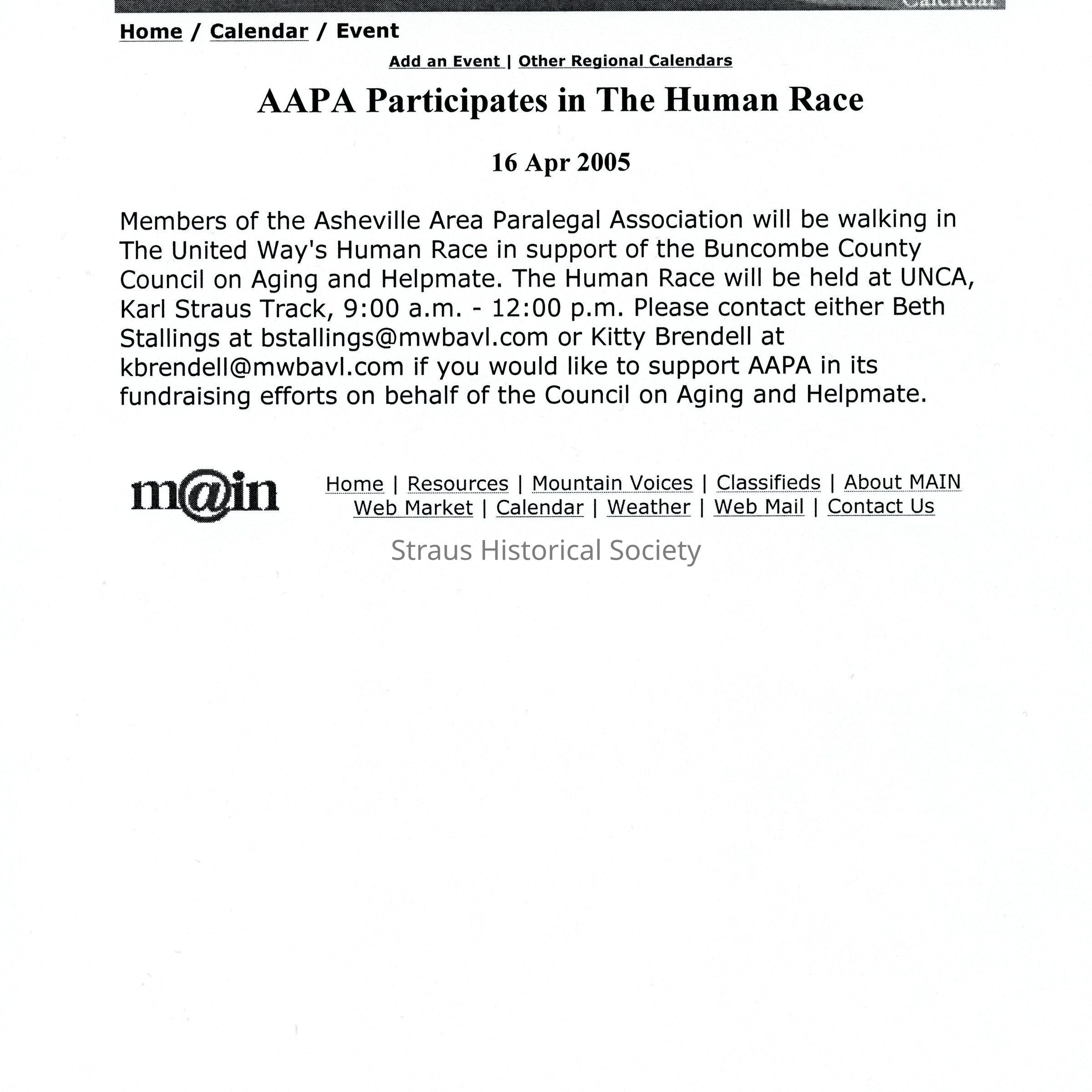 Internet article: "AAPA Participates in The Human Race" Mountain Area Information Network: The Community network for Western North Carolina. 16 April 2005. One page.Entry/Object ID