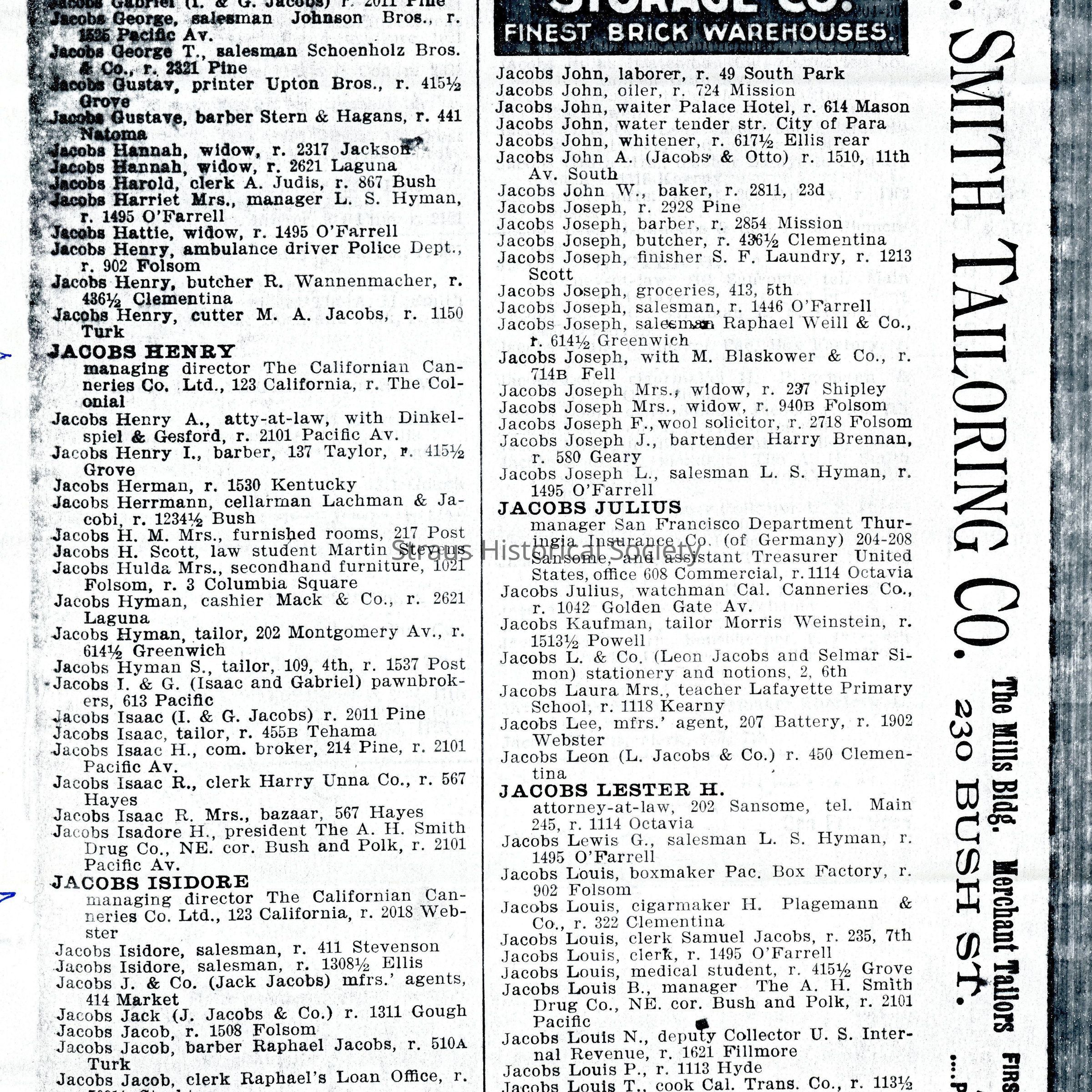 This directory contains a listing for Henry Jacobs and Isidore Jacobs, The Californian Canneries Co. Ltd. The Jacobs brothers married Carrie and Mira, daughters of Emanuel Straus.