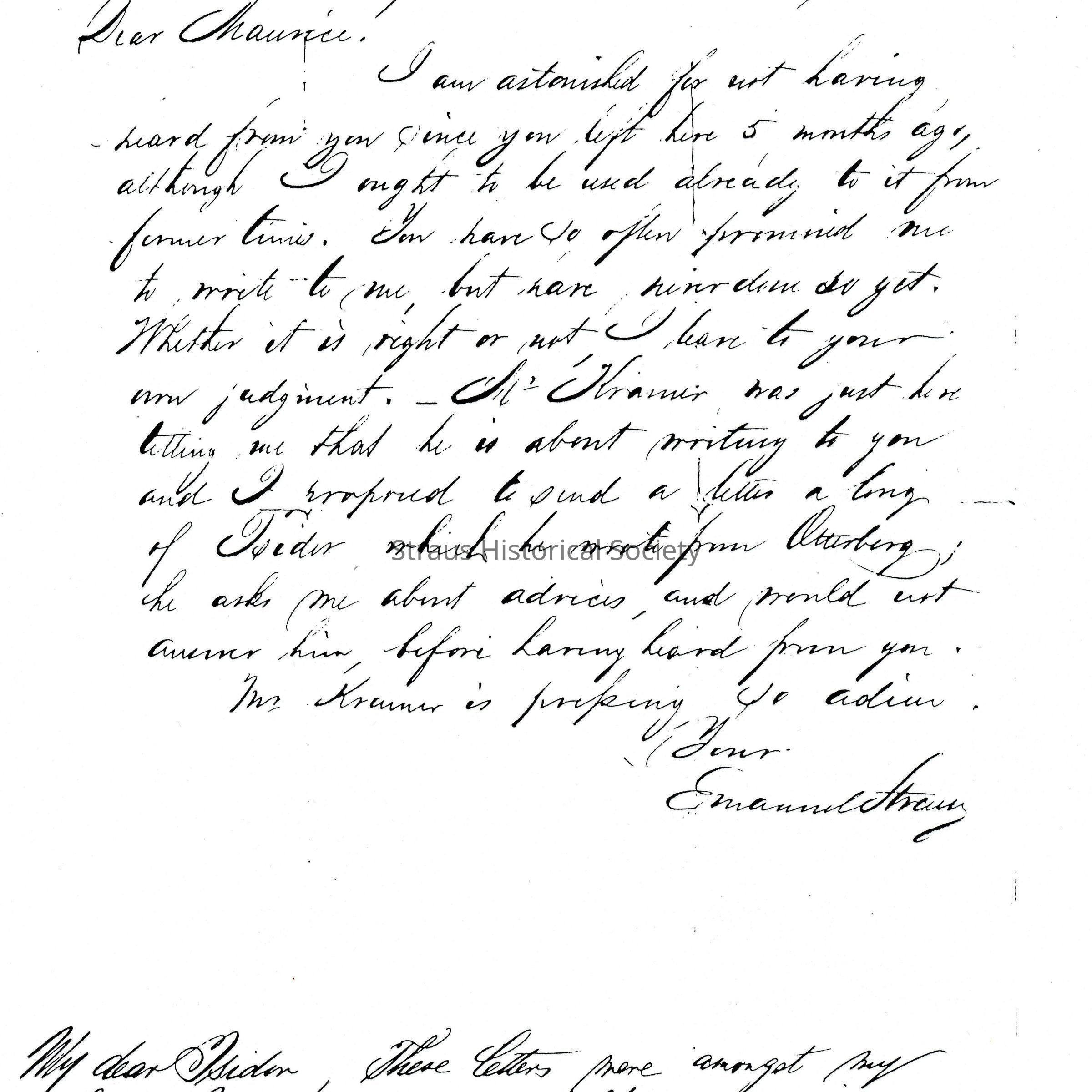 Emanuel complained about not hearing from Maurice. A postscript was written to Isidor from Uncle Jacob telling him that these letters were found among "my brother Moritz's papers." (This letter can also be found in Emanuel Straus's file and Jacob Straus's file.)