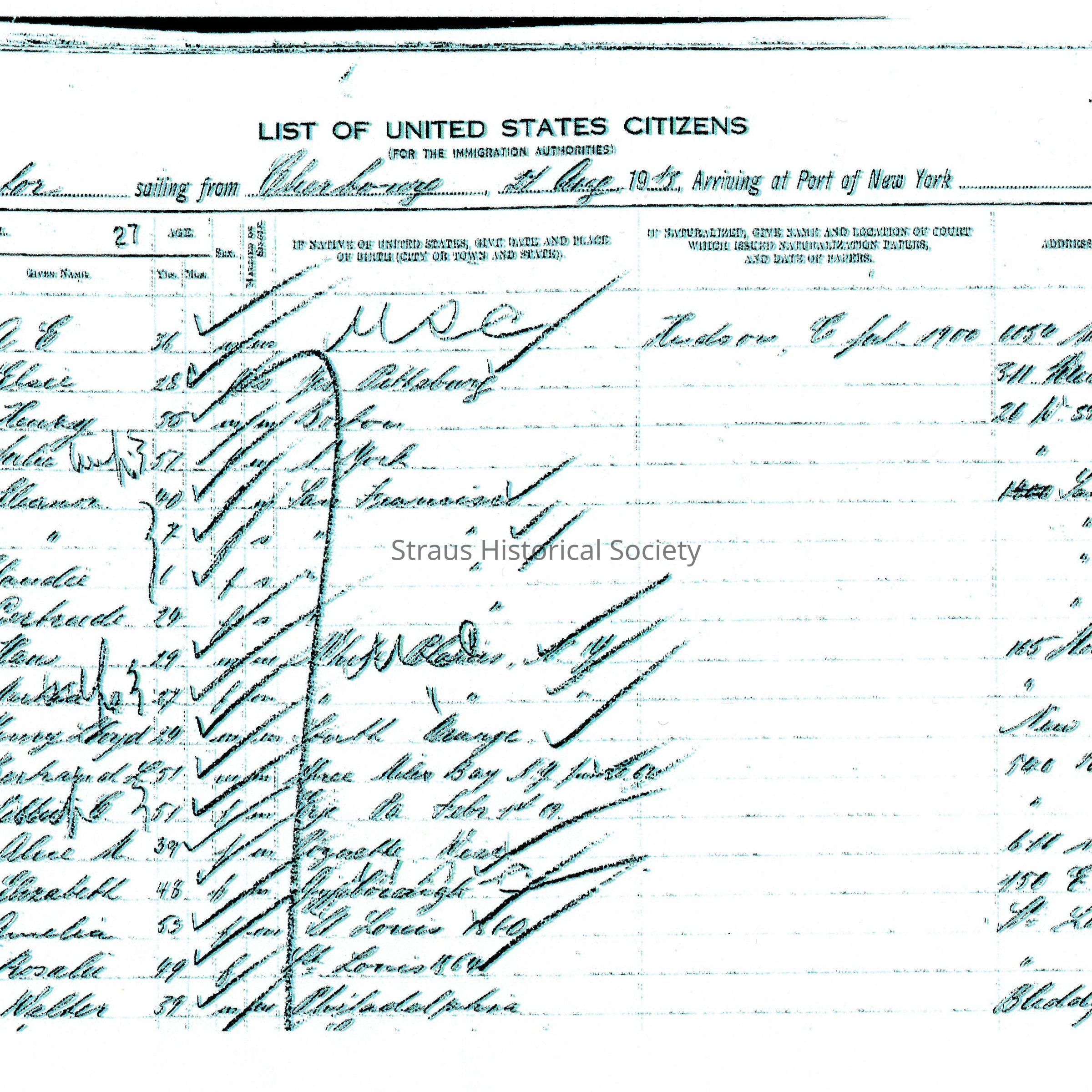 1913 Passenger Manifest: Hans Straus, age 29, native of White Plains, NY and Martha Straus, age 22, native of White Plains NY, left Cherbourg, Manche, France on the ship " Imperator" on August 24, 1913 and arrived in NY on August 27, 1913. They lived at 165 Horton Avenue, New Rochelle, NY.