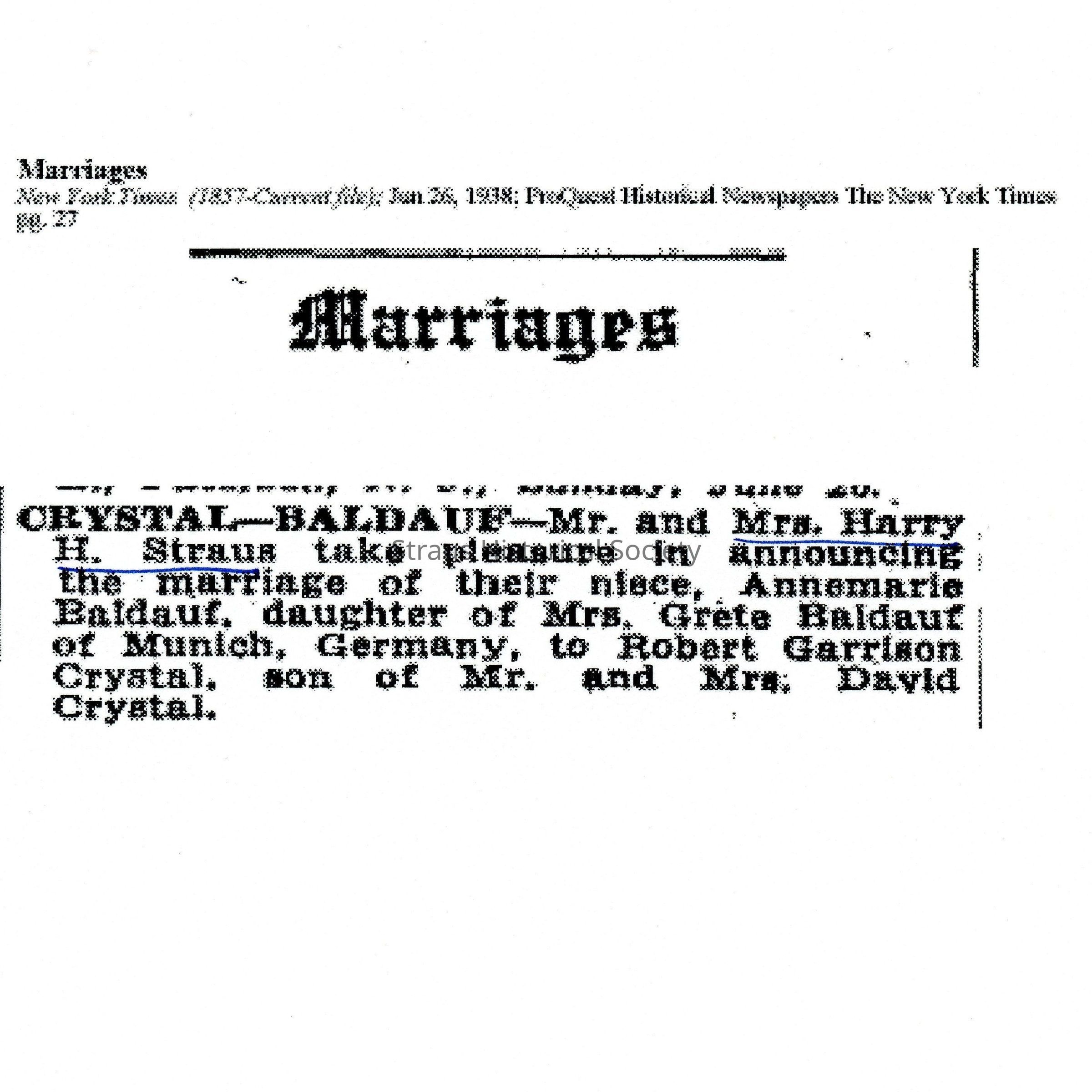 Article: "Marriages: Crystal - Baldauf," The New York Times. 26 January 1938.Entry/Object ID