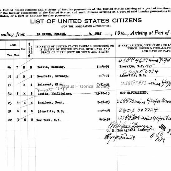 Passenger Manifest: "Tufts Victory," Sailing from Le Havre, France to New York, arriving July 16, 1946. Karl H. Straus, age 25.Entry/Object ID