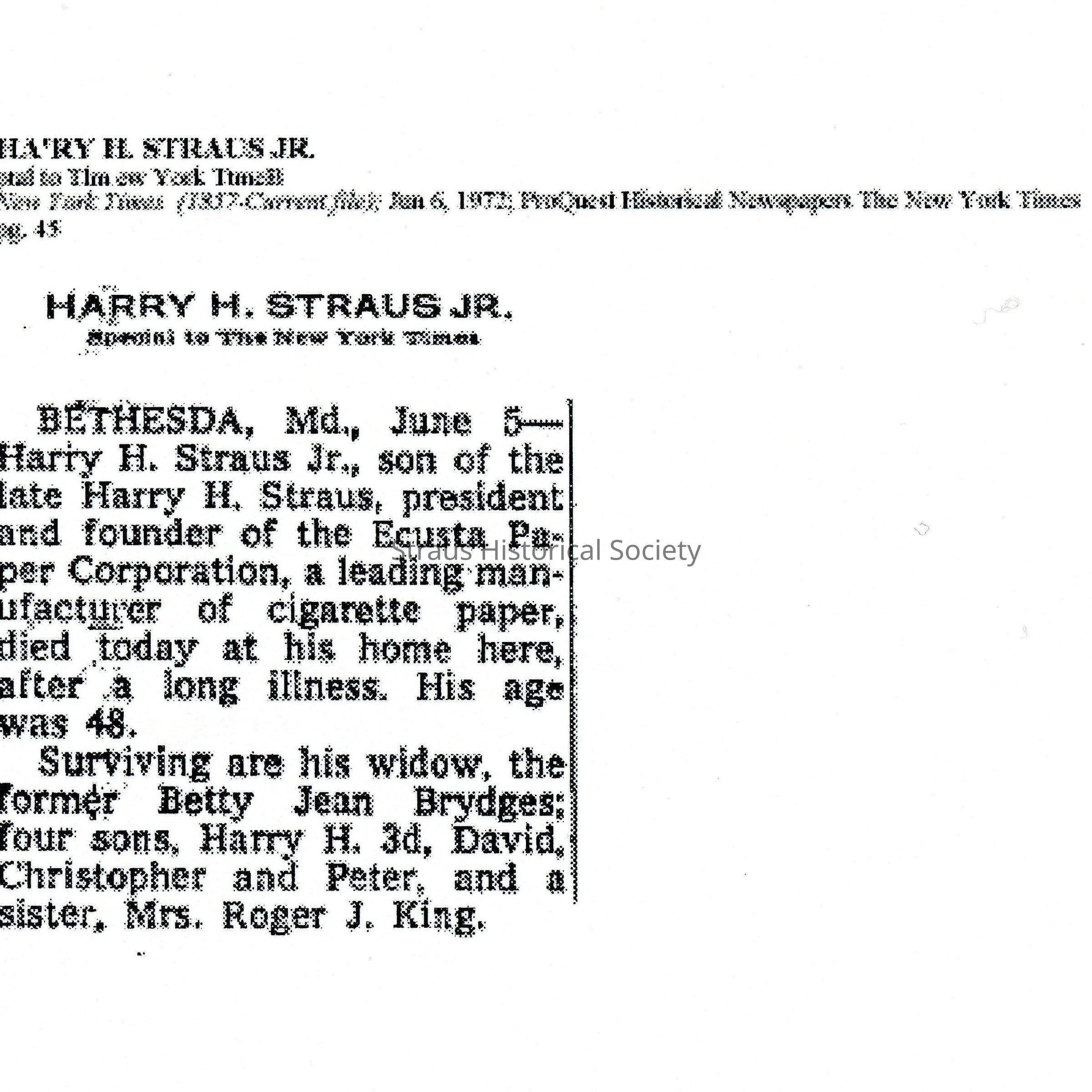 Harry H. Straus Jr., died from a long illness at the age of 48. At the time, he was survived by his wife Betty J. Straus, his four sons, Harry H. 3rd, David, Christopher, and Peter and by one of his sisters, Mrs. Roger J. King.