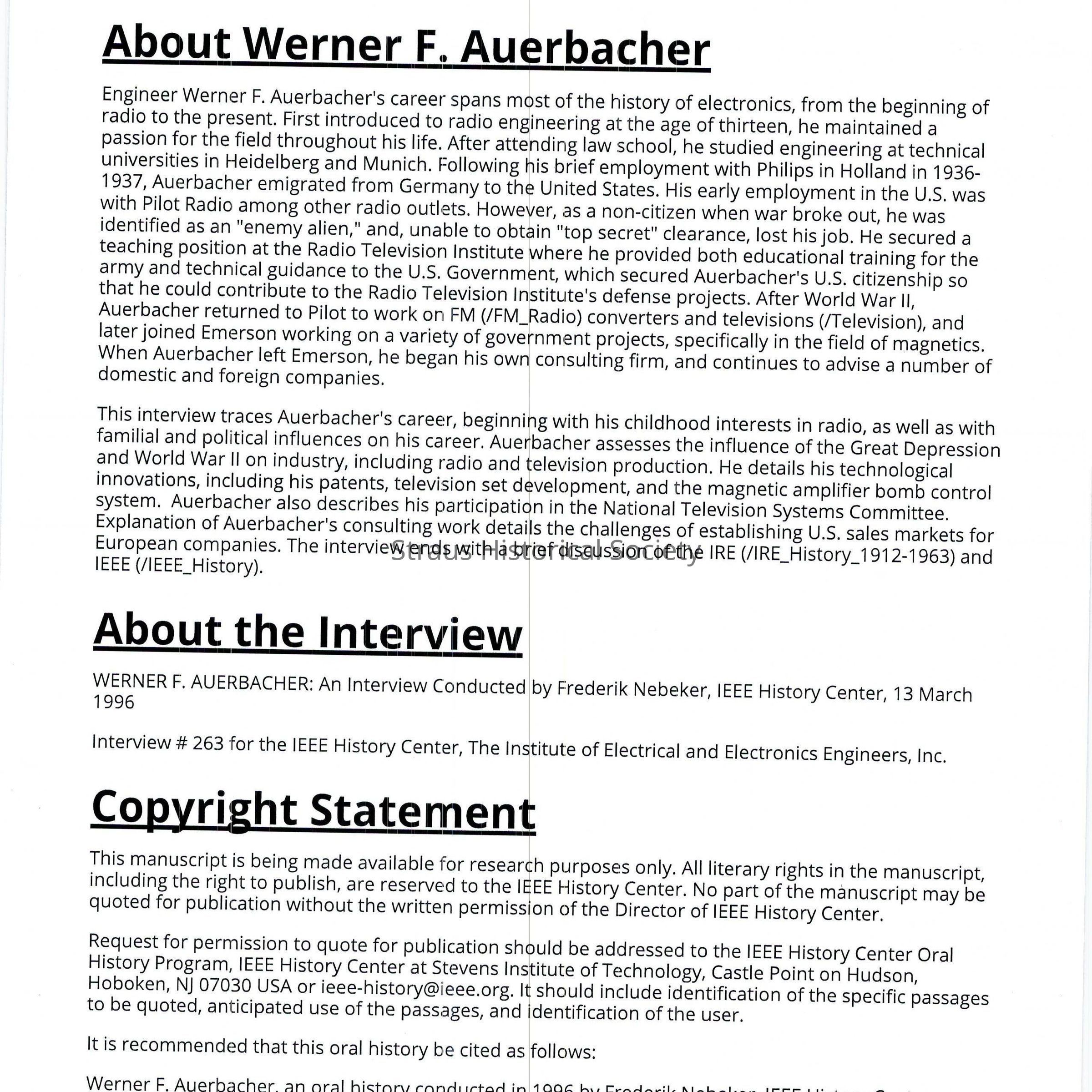 Oral History: Werner F. Auerbacher, conducted by Frederick Nebeker, IEEE History Center. History includes personal and professional details about the life of Werner F. Auerbacher. Including but not limited to: family history, daily home life, profession and immigration to the United States.