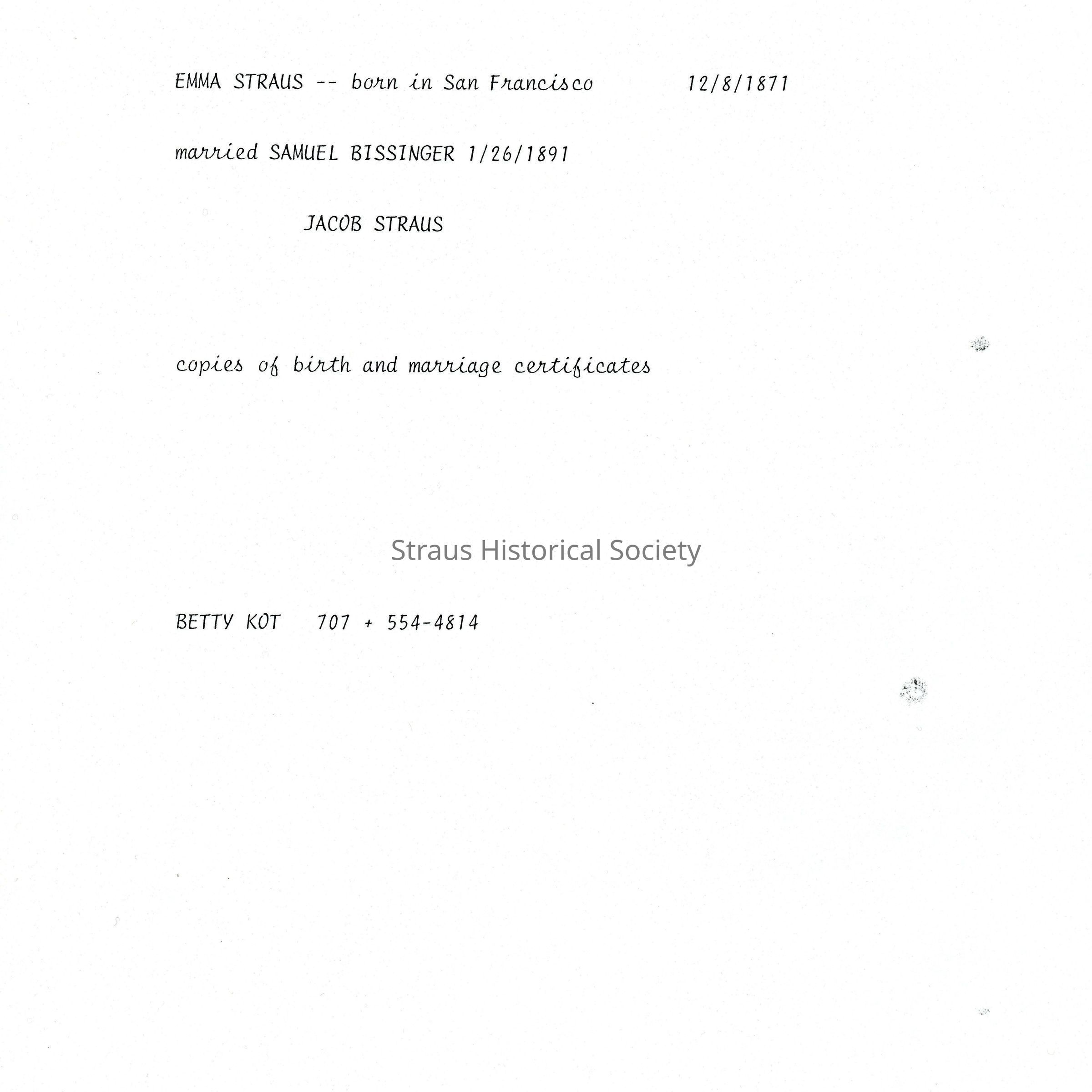 Research Materials: Kot, Betty (geneologist): Emma Straus information. Information on birth and marriage of Emma Straus.