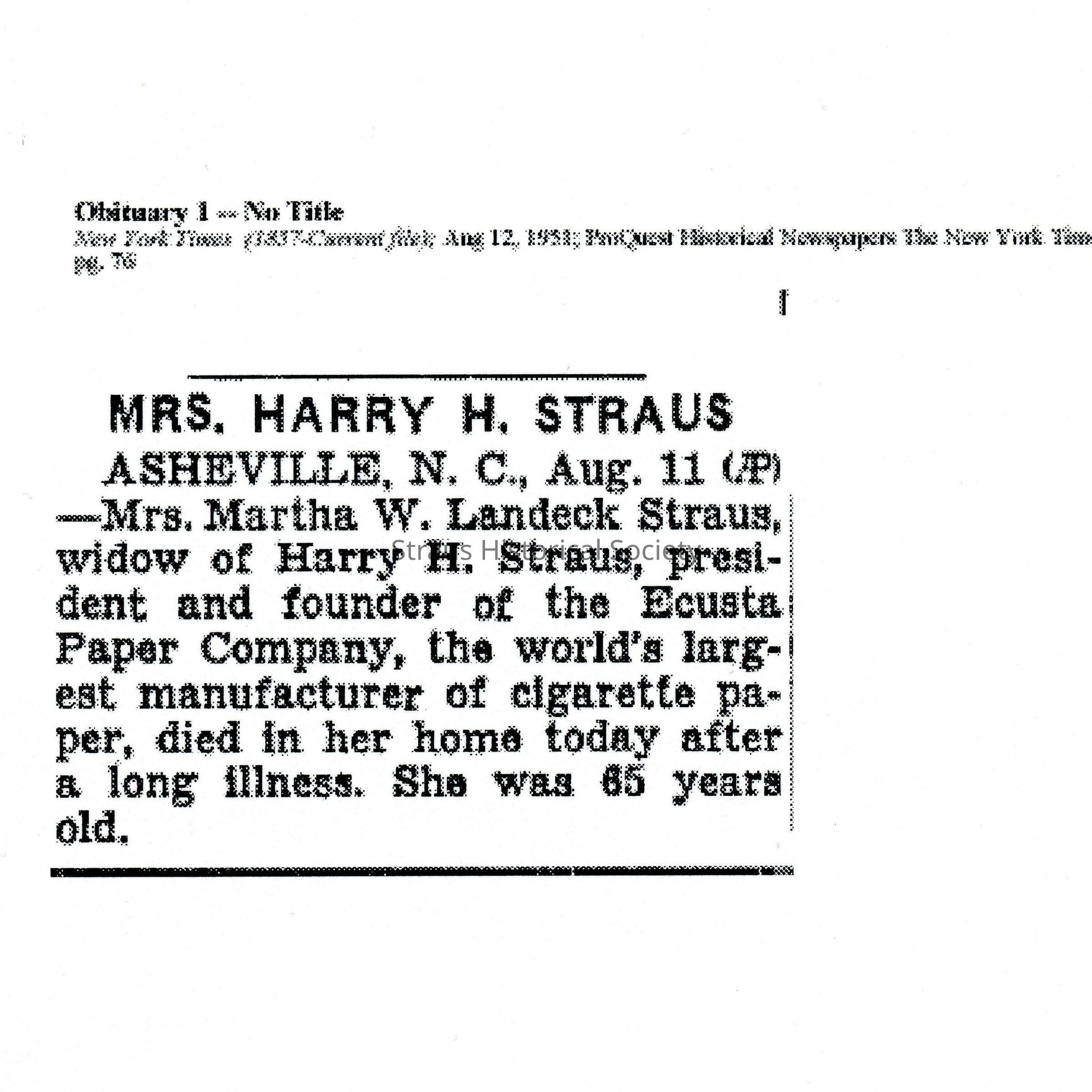 Obituary: "Mrs. Harry H. Straus," The New York Times. 12 August 1951.Entry/Object ID