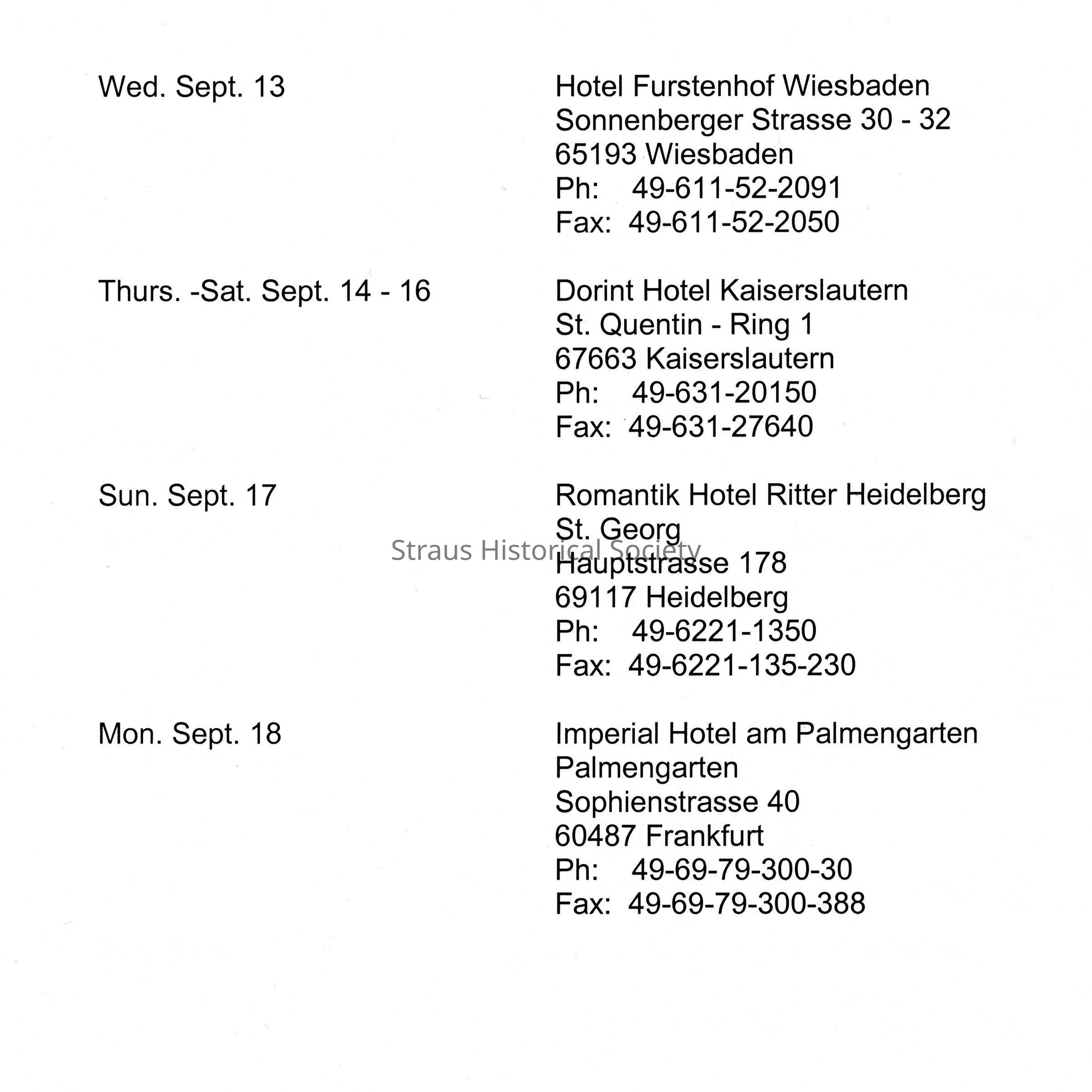 The Straus Historial Society organized a tour for members of the Straus Family to discover where their ancestors originiated from. This is the itnerary for that trip.