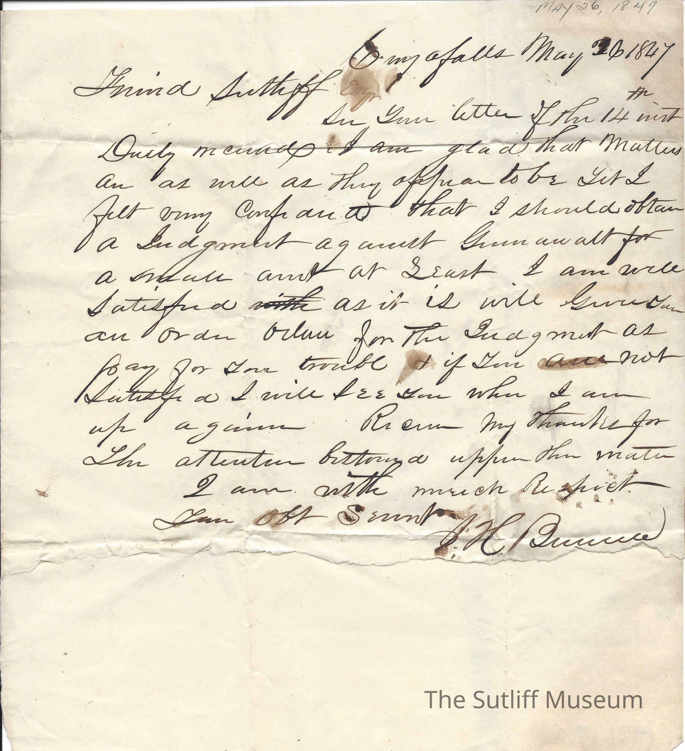 A letter from J.H. [?] to Levi Sutliff regarding judgment on a legal case as well as his thanks.Collection