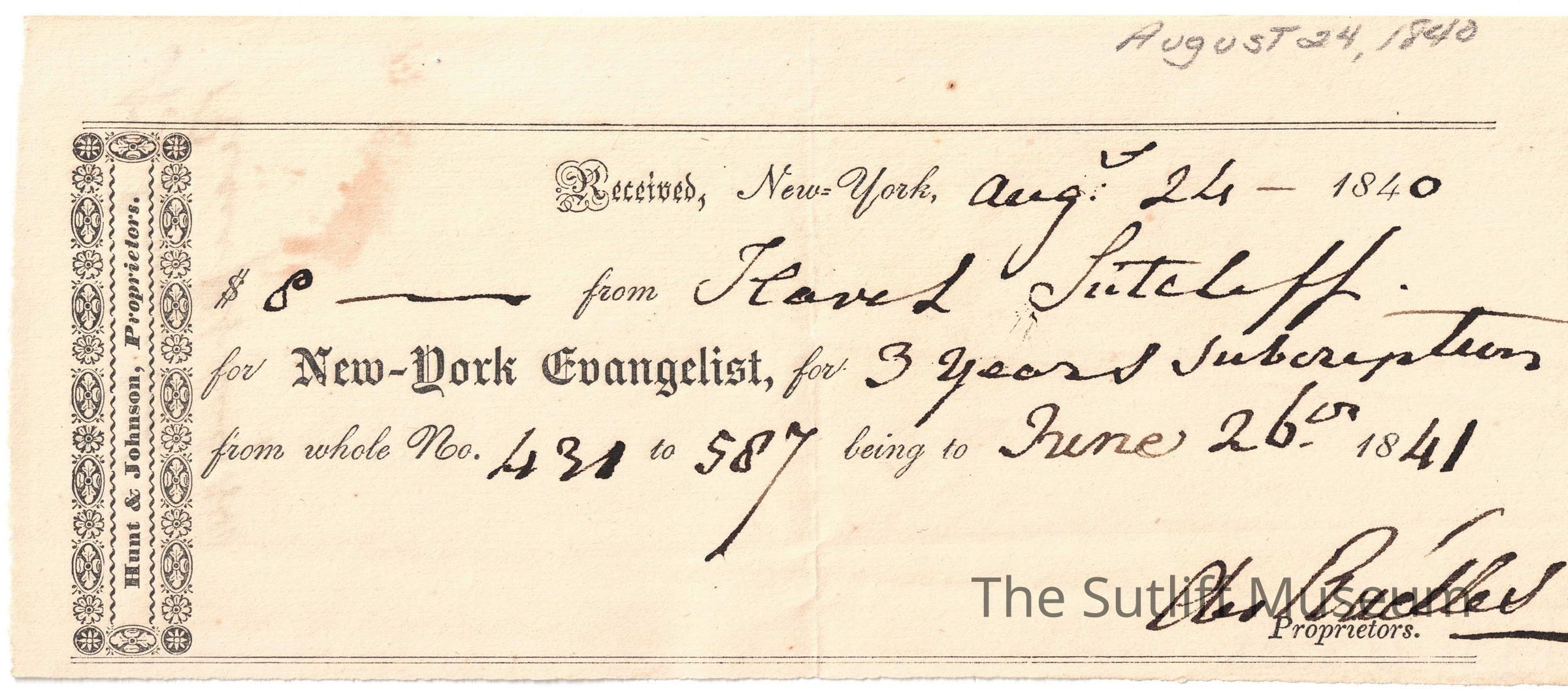 Receipt from the New-York Evangelist for a 3 year subscription Flavel Sutliff paid for.