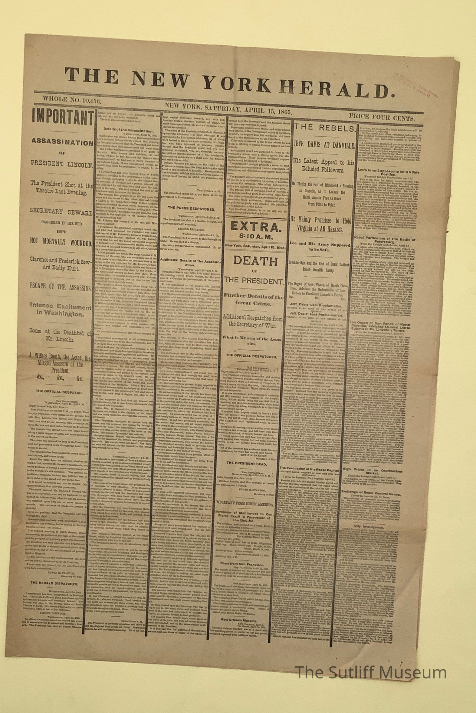 The New York Herald newspaper published on April 15, 1865. This edition discusses the death of President Lincoln.Collection