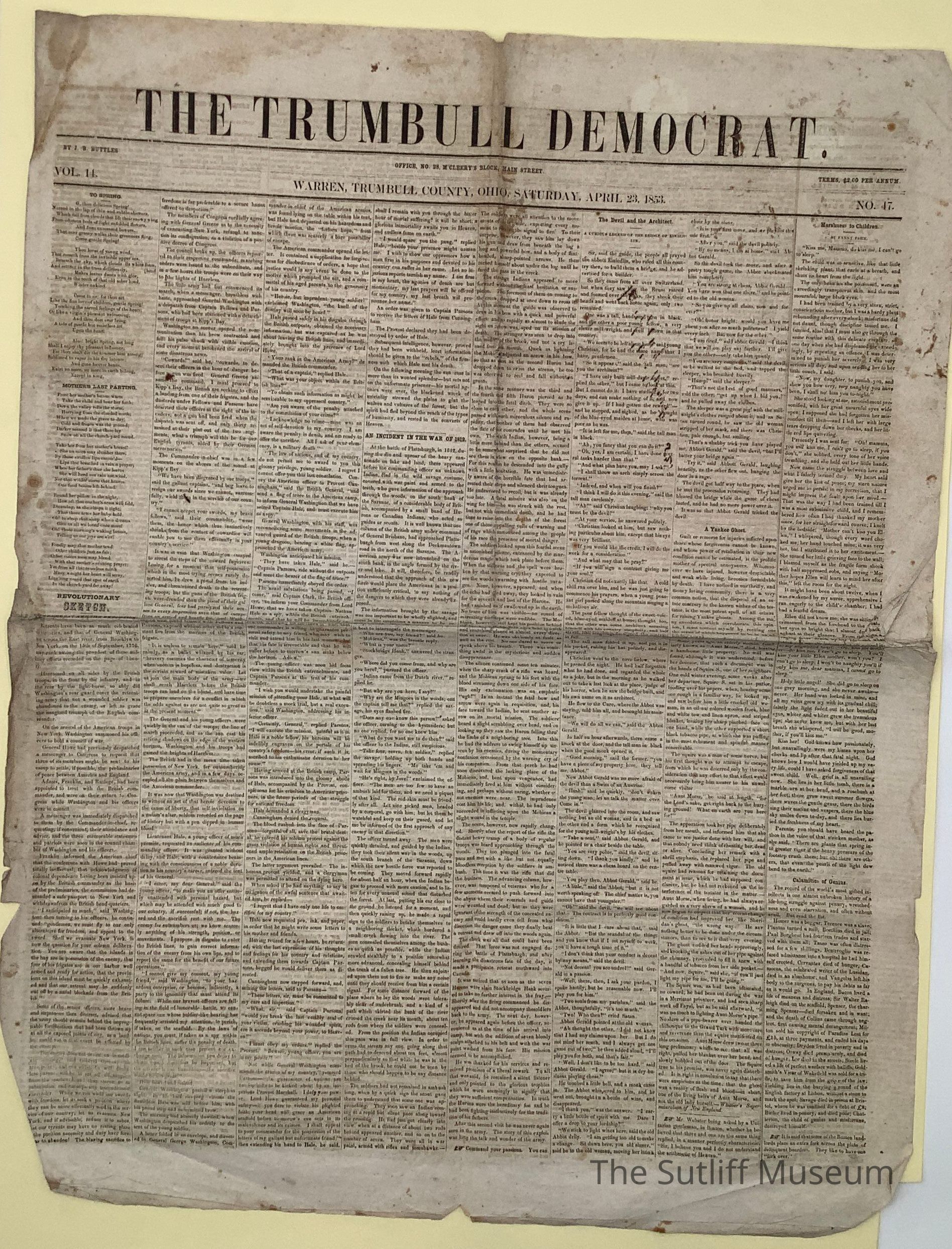 The Trumbull Democrat newspaper published on April 23, 1853.Collection