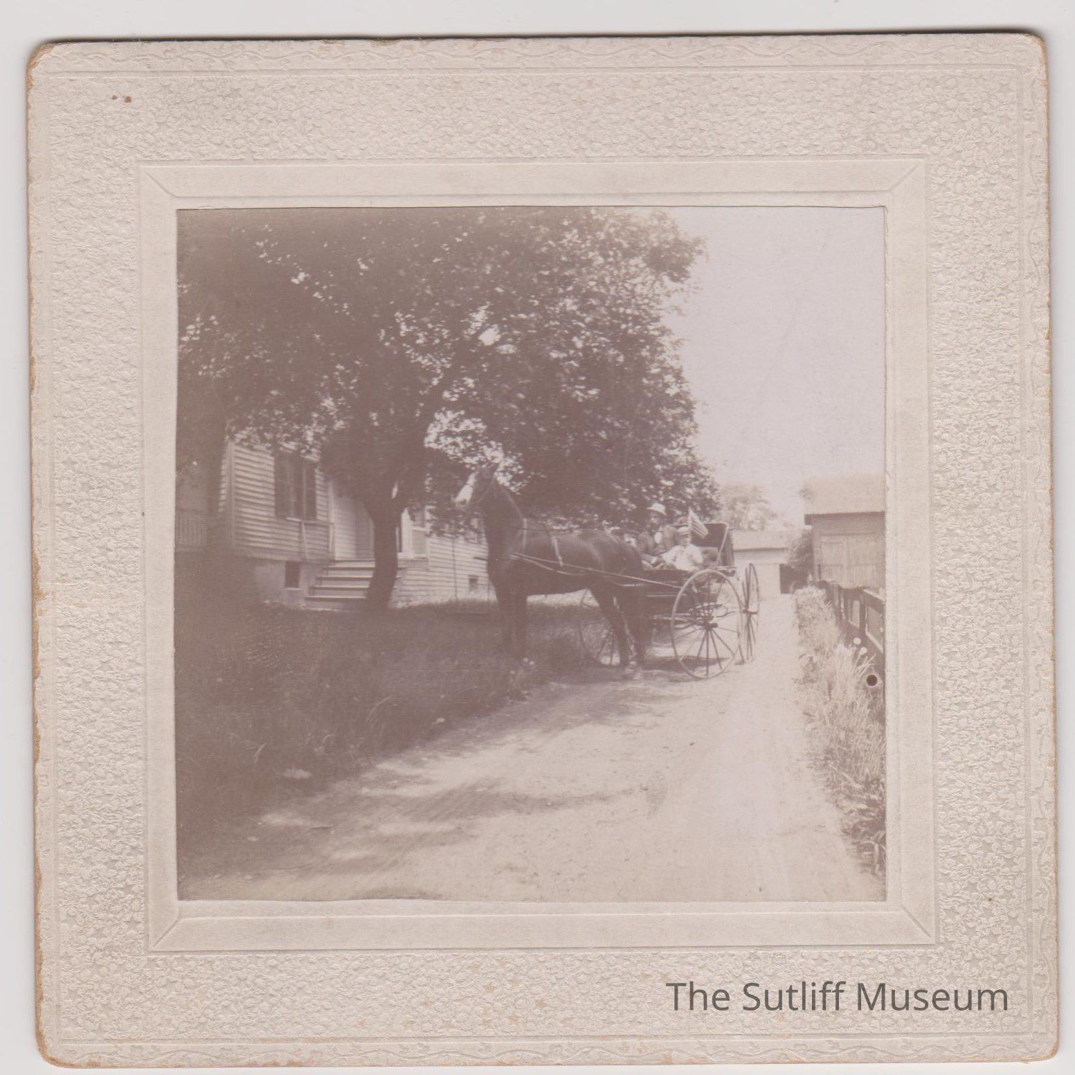 Edward J Brainard and son Edward Sutliff Brainard on Decoration Day, 1900. Both are being pulled in a horse drawn buggie.