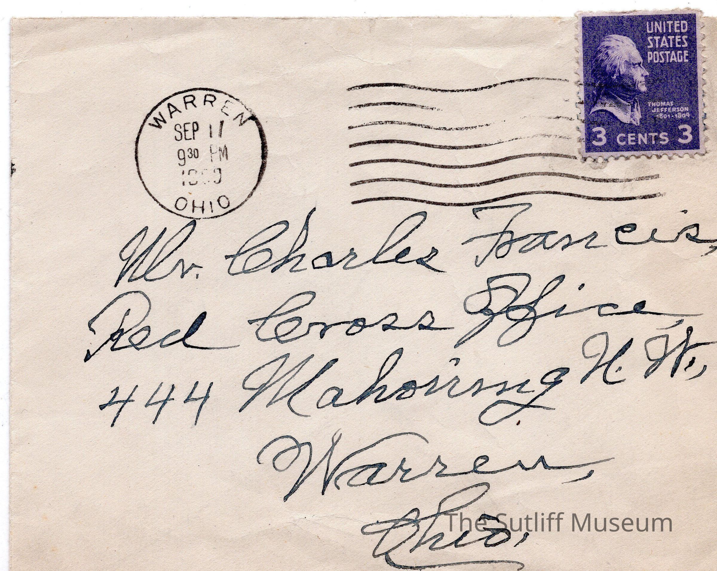 A calling card and envelope addressed to Charles Francis from Phebe Temperance Sutliff regarding best wishes for future Red Cross work and appreciation for his gift to the library.Relationships