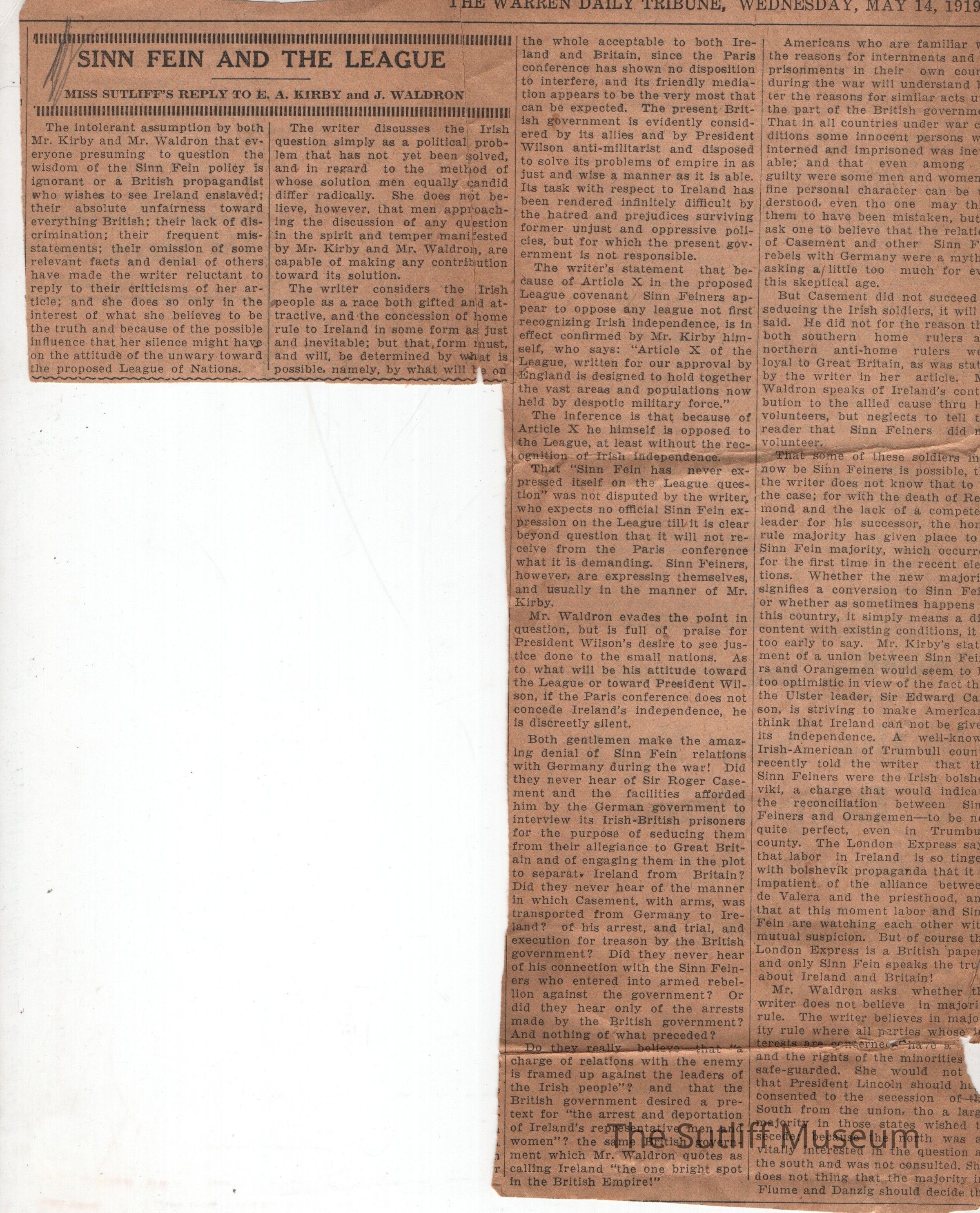 An article titled "Sinn Fein and The League" Miss Sutliff's reply to E.A. Kirby and J. Waldron. Dated 5/14/1919Collection