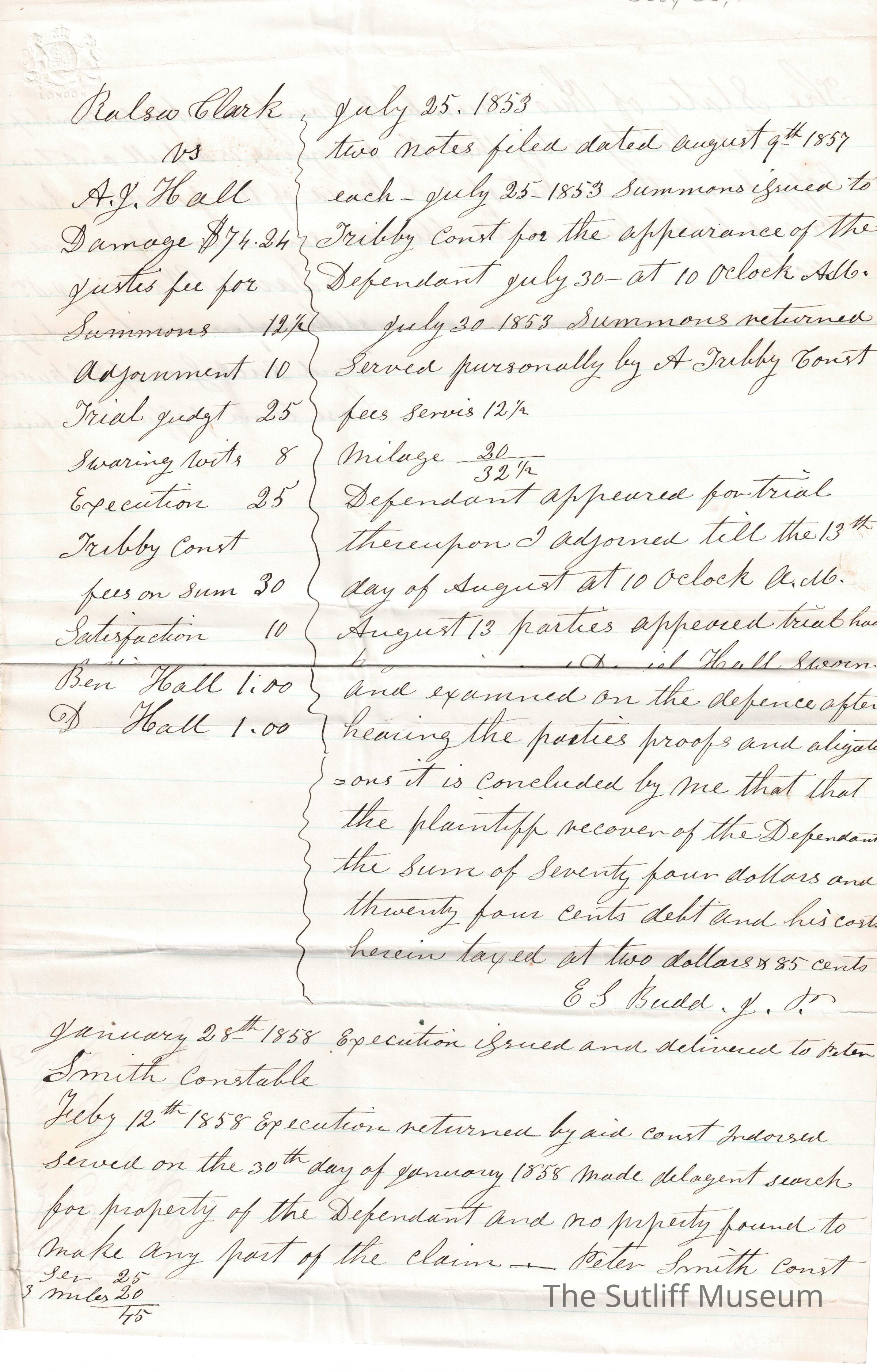 This is a record of the legal case Ralsa Clark vs A.J. Hall for damage charges. The line that the folds prevent from reading half way down is "Witness fees} Benjamin and Daniel Hall sworn"Relationships