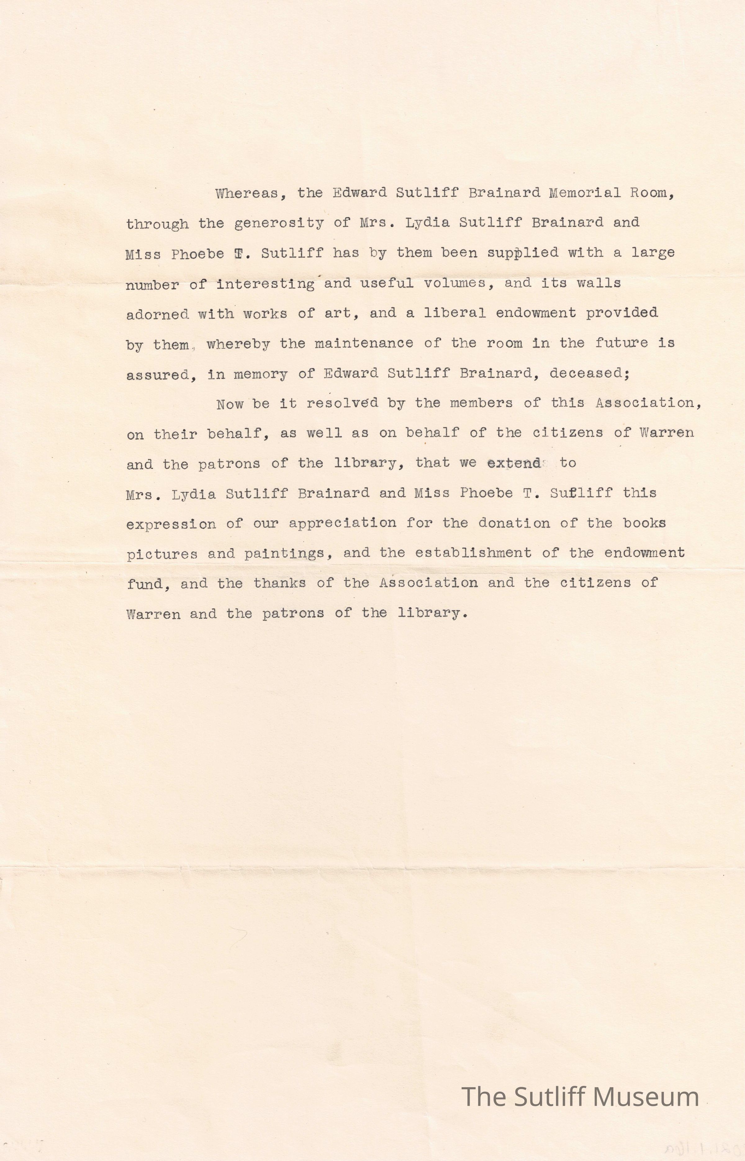 A letter describing the Edward Sutliff Brainard Memorial Room and the thanks of the Warren Library Association for the donation.Relationships