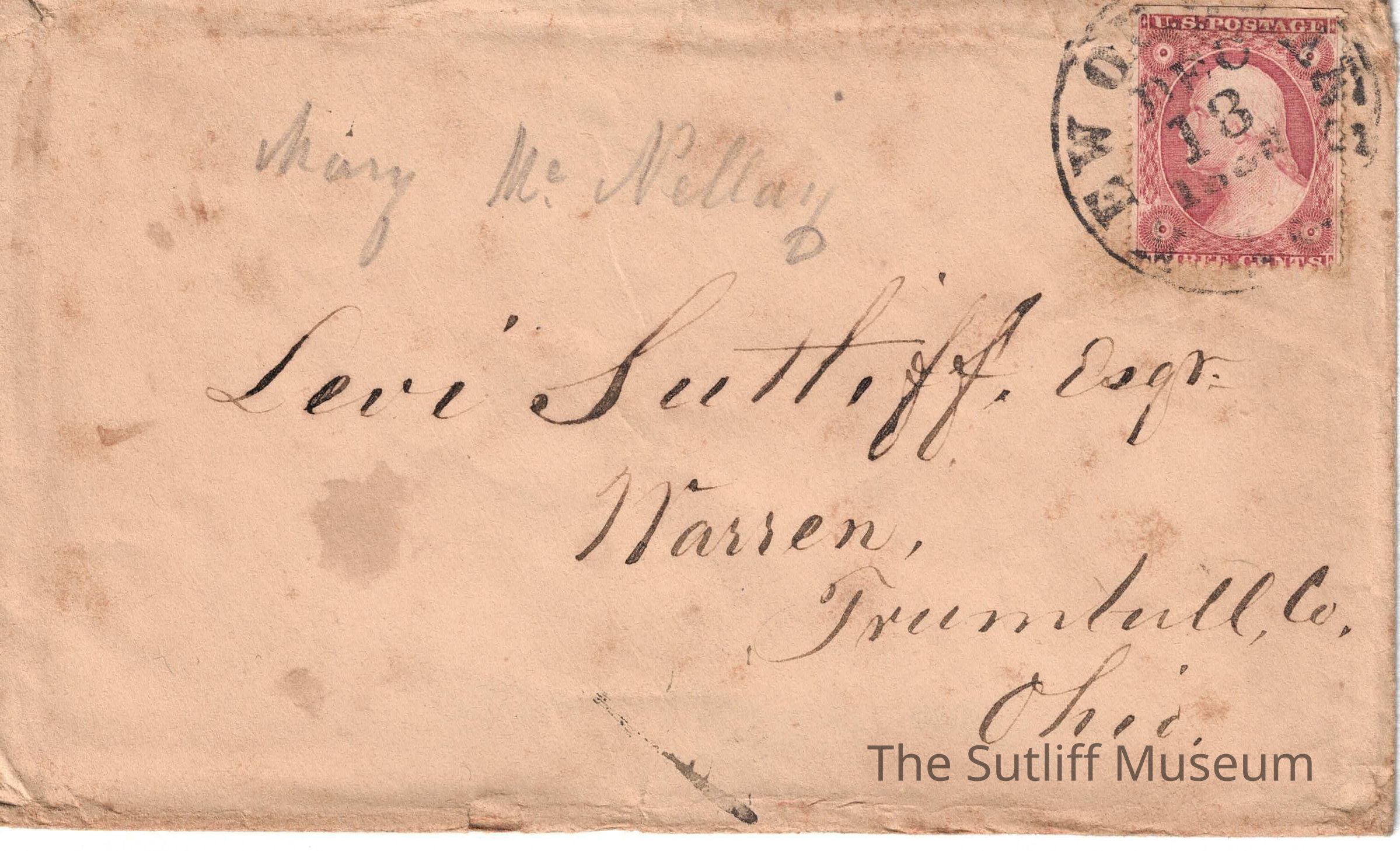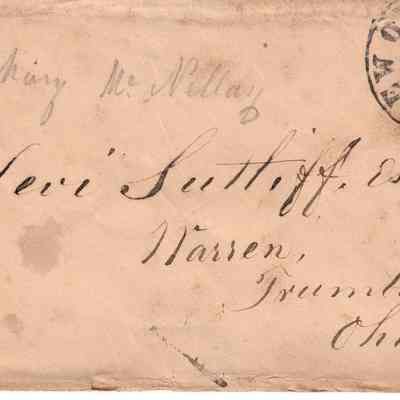 An envelope addressed to Levi Sutliff in Warren, Trumbull County Ohio. Stamped Dec 13, 18?2 from New Orleans.Relationships