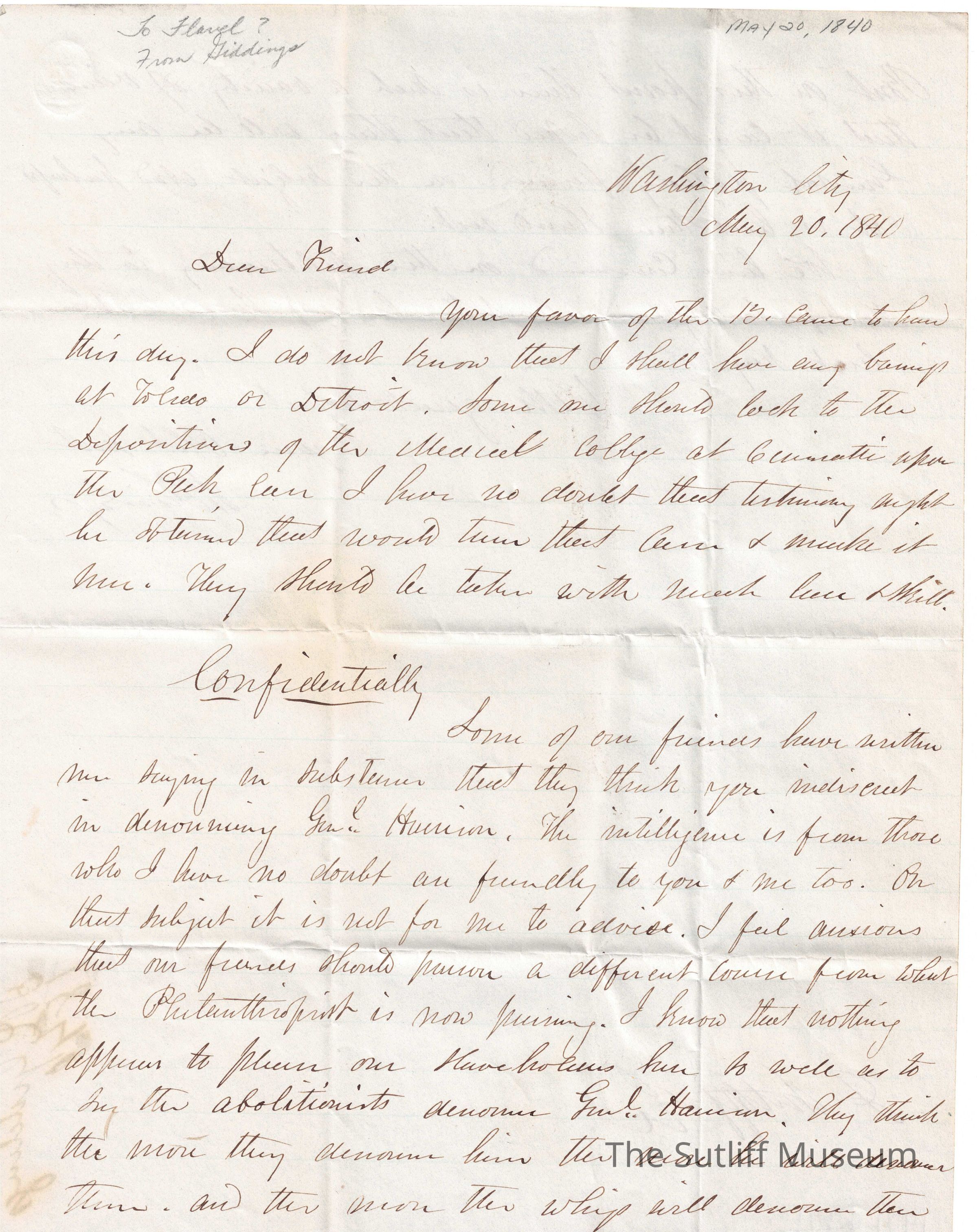 Letter from Joshua Reed Giddings to Flavel Sutliff. He responds to a favor Flavel asked him and updates about the Abolitionist movement.Collection