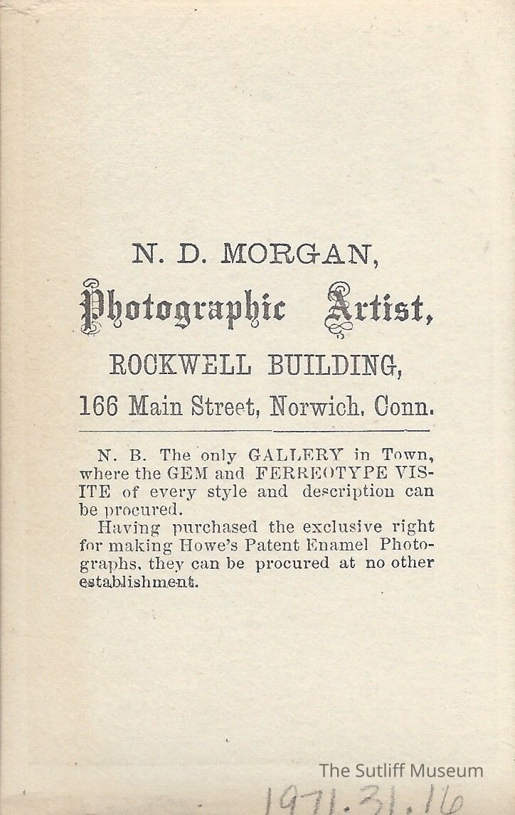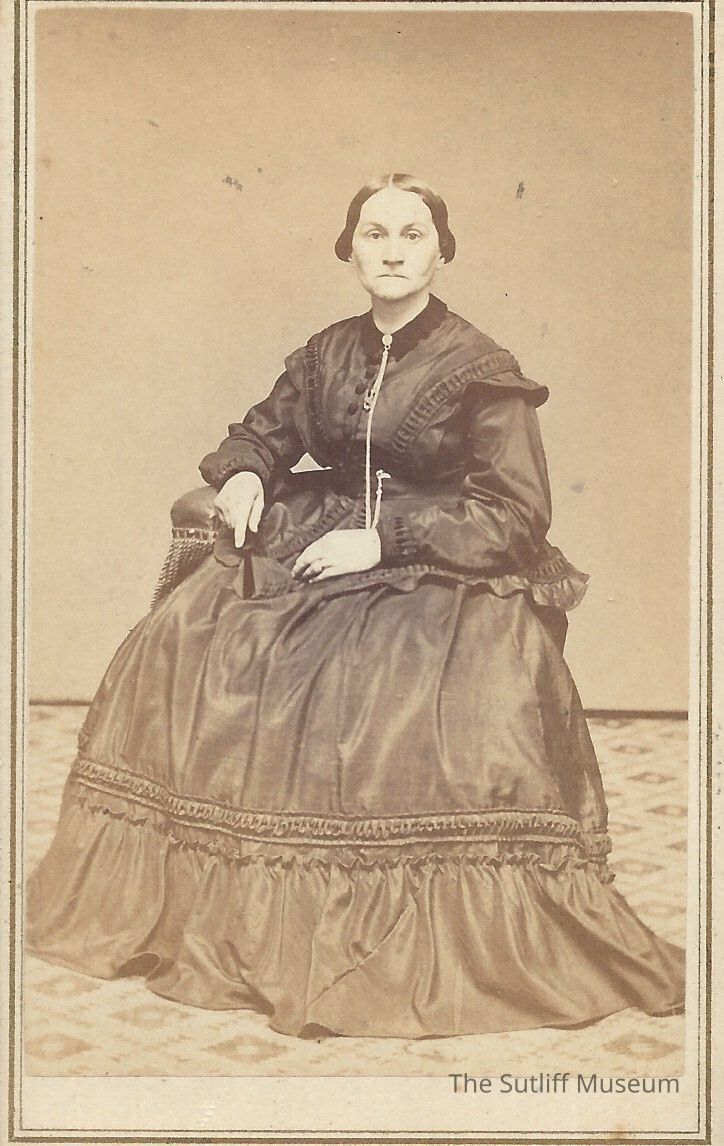 Photograph of Phebe Lord Marvin Sutliff. The photographer's stamp reads: NB. The only GALLERY in Town, where the GEM and FERREOTYPE VISITE of every style and description can be procured. Having purchased the exclusive right for making Howe's Patent Enamel Photographs. [sic] they can be procured at no other establishment.