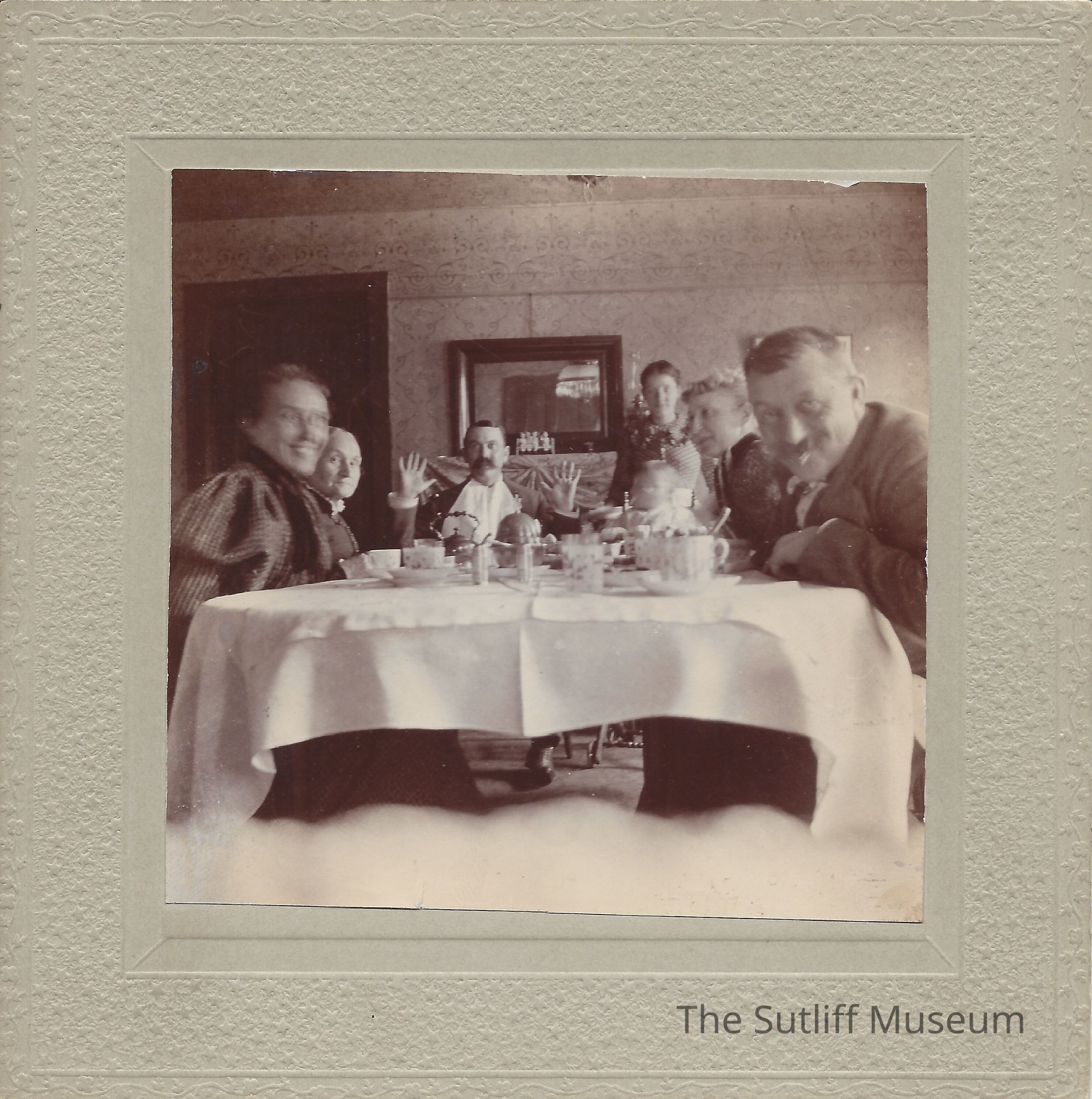 Photograph (L-R), of an Lydia Bostwick Sutliff Brainard, Phebe Lord Marvin Sutliff, Edward J "EJ" Brainard, Edward Sutliff Brainard, an unknown female,an unknown female, and an unknown male, dated Sunday PM April3rd 1898. The two unknown people on the left are possibly EJ's parents.Collection