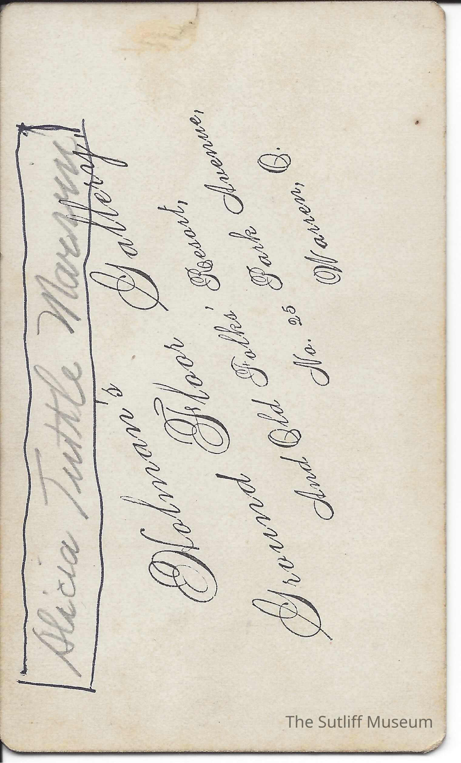 Photograph of Alicia Tuttle, head and shoulders. "Alicia Ardula Tuttle Marvin" written on the back in pencil and boxed in black pen.Collection