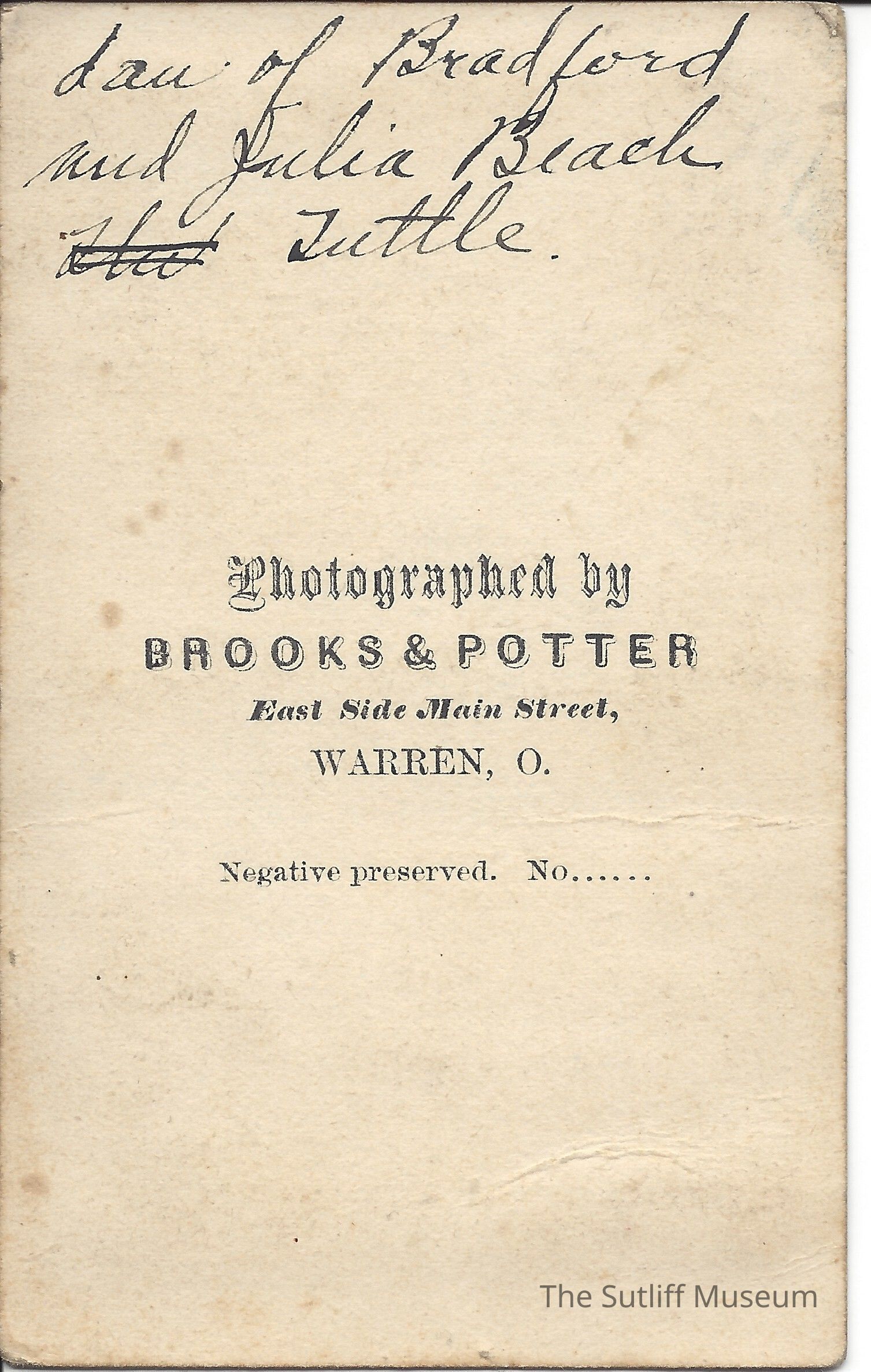 Photograph of Alicia Tuttle, headshot. "Alicia Tuttle" written on the front bottom in pencil. "dau of Bradford and Julia Beach Tuttle" written in black pen on the back.Collection