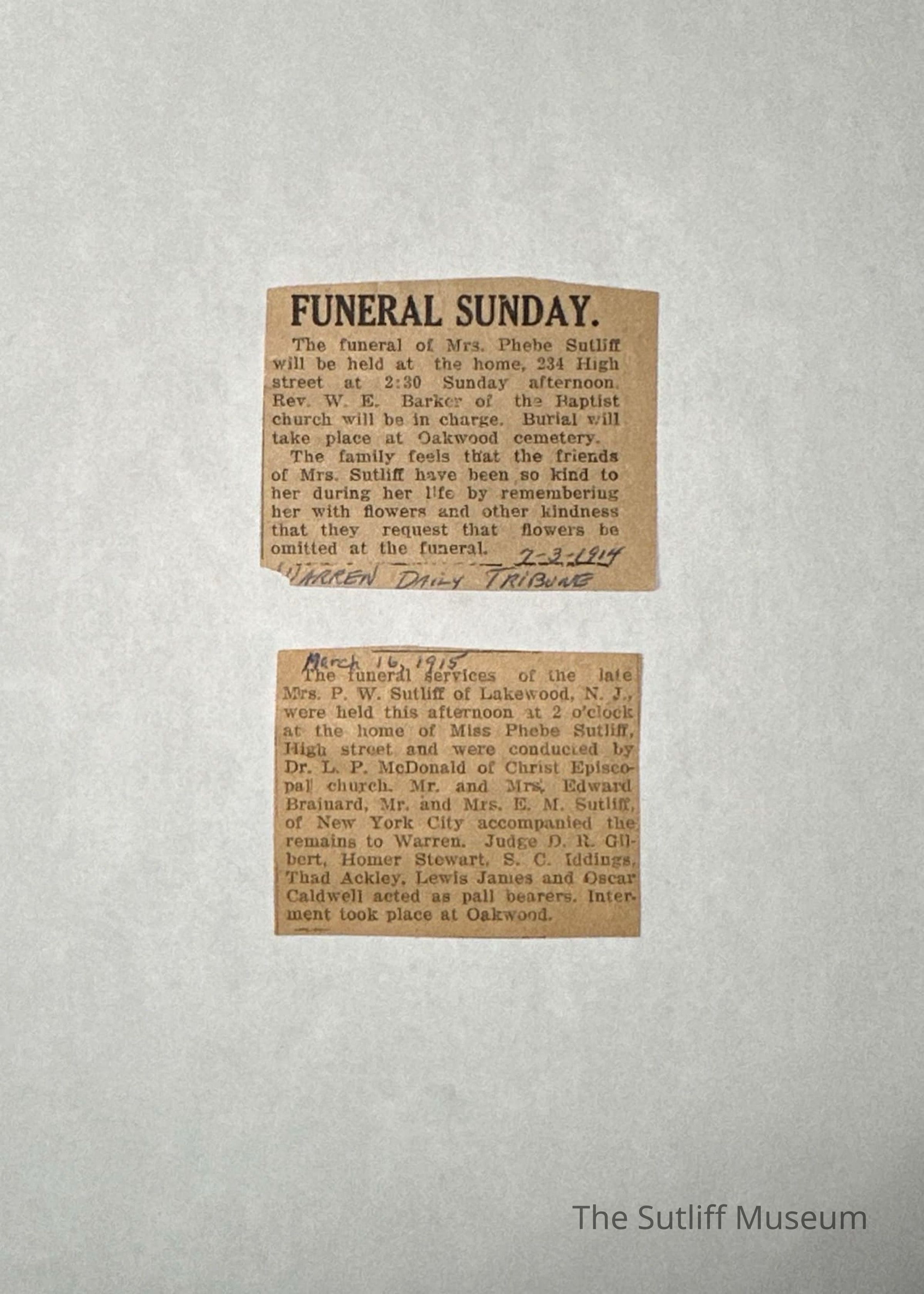 Newspaper clipping with the announcement of Phebe Marvin Sutliff's funeral date, published July 3, 1914. Another newspaper clipping was given the same number and is the announcement of Mrs. P.W. Sutliff's funeral in March 16, 1915.Collection
