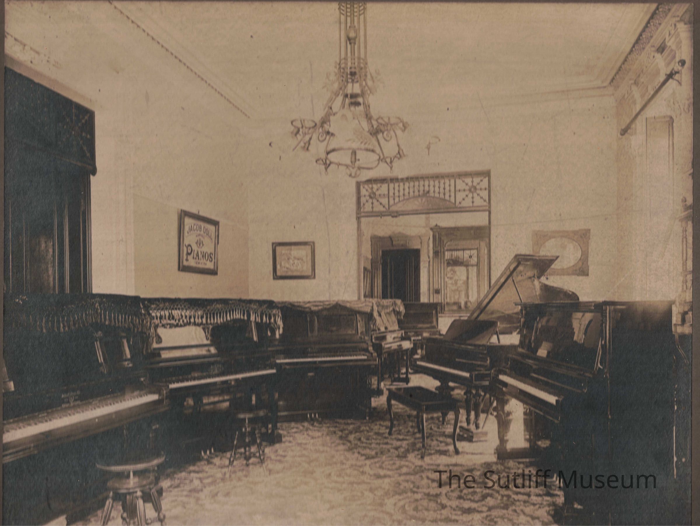 Hall's Music Shop interior, large pianos.Collection