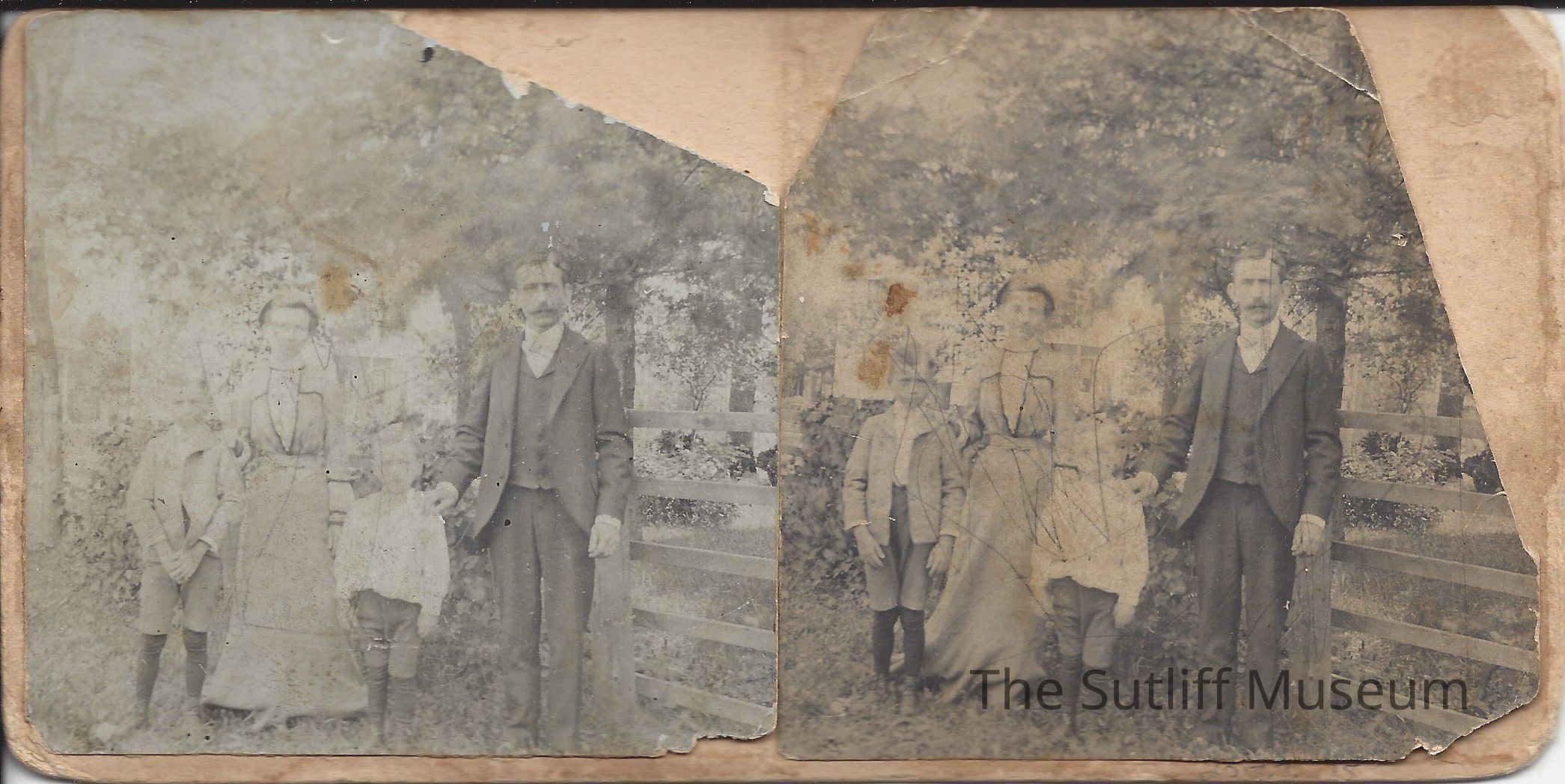 Two photographs of a young boy standing near several boats with a dock in the background. Reverse has two photographs of a family of 4 in front of a fence. The front right side along the edge states in black ink "Sold only by Underwood & Underwood New York, London, Tortonto Canada, Ottawa-Kansas"Collection
