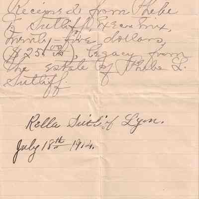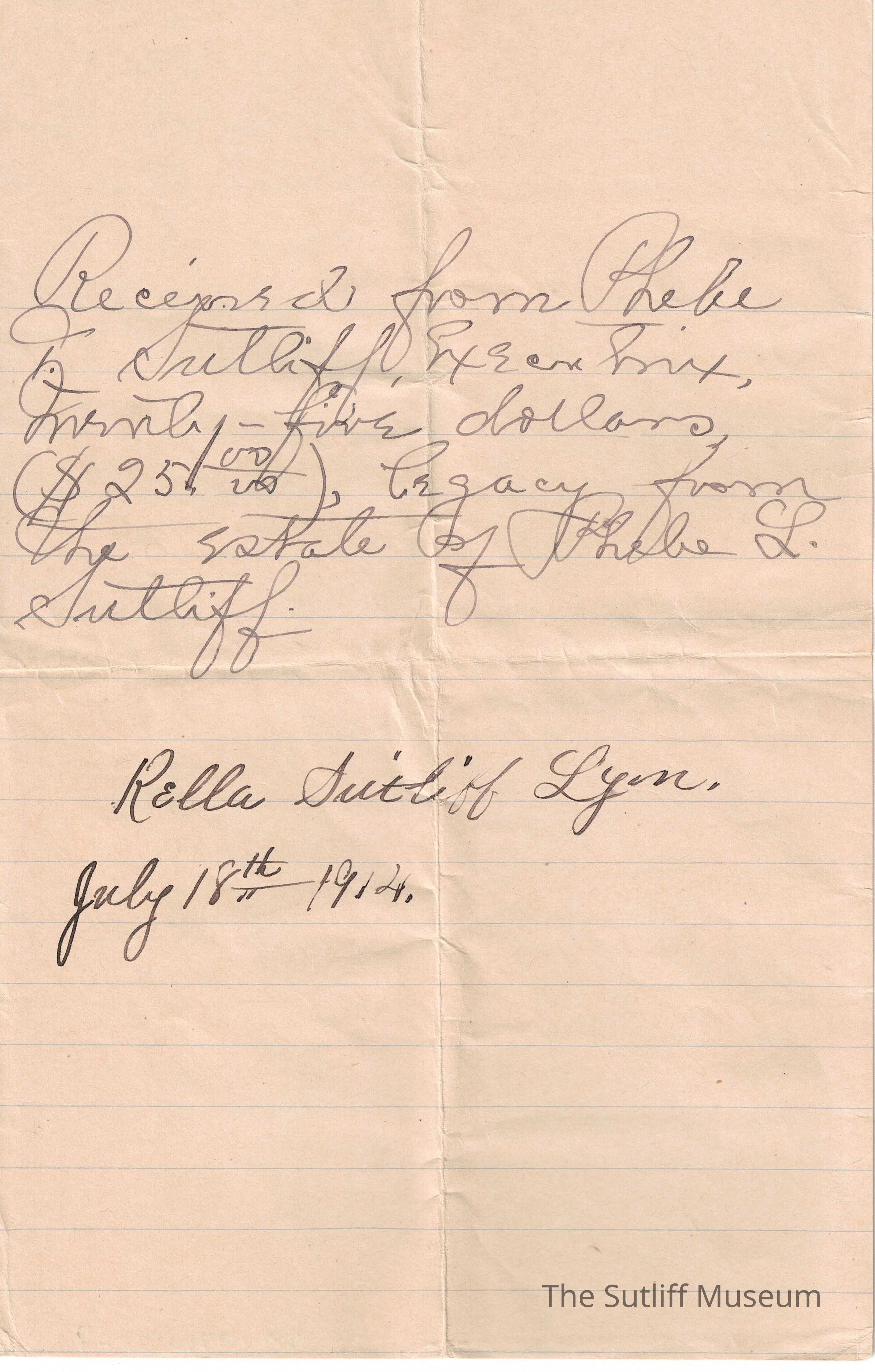 A receipt to Jane Aurelia "Rella" Sutliff Lym for $25.00 associated with Phebe Lord Marvin Sutliff's death receipts.Collection