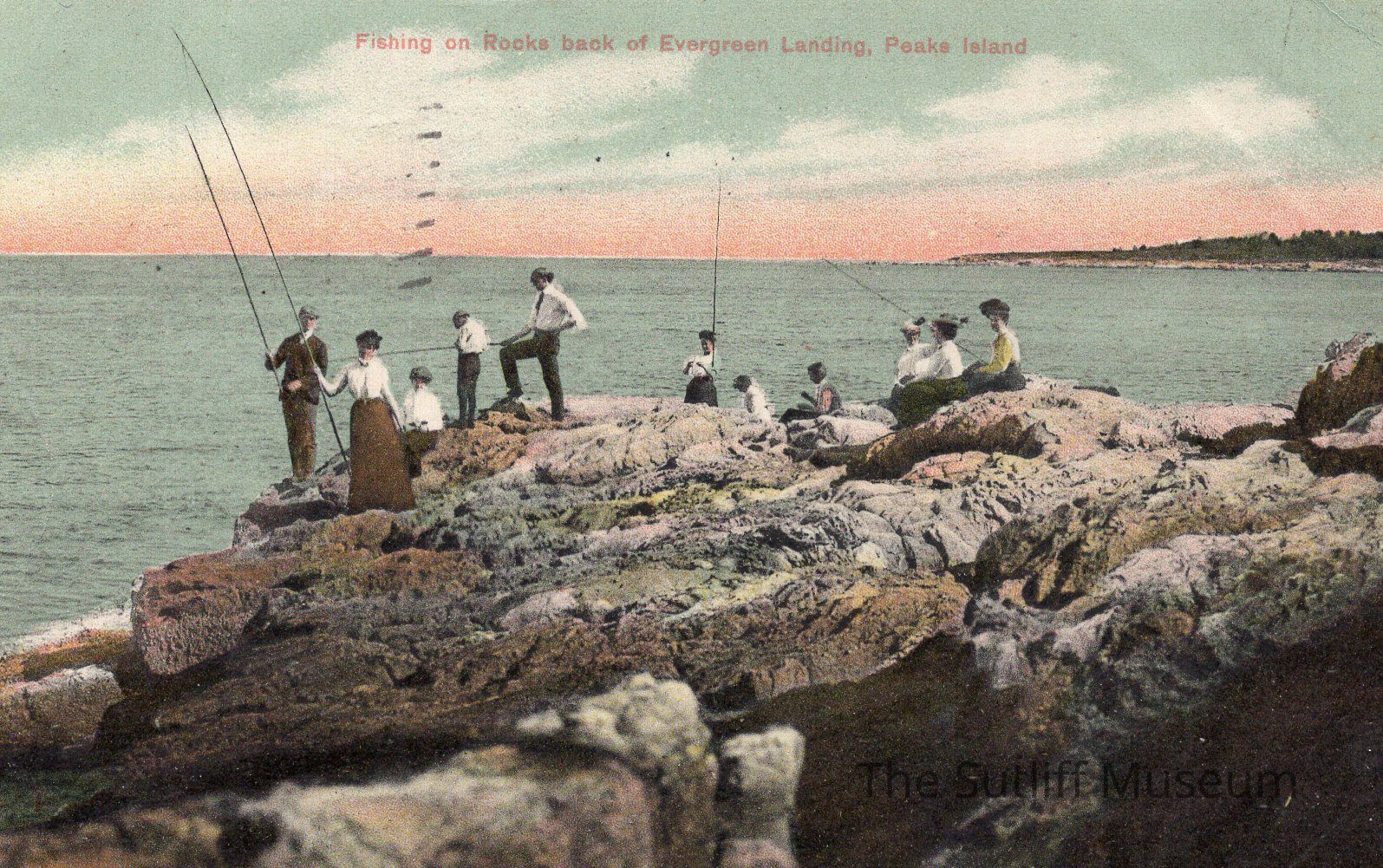 A postcard of people Fishing on Rocks back of Evergreen Landing, Peaks Island.Collection