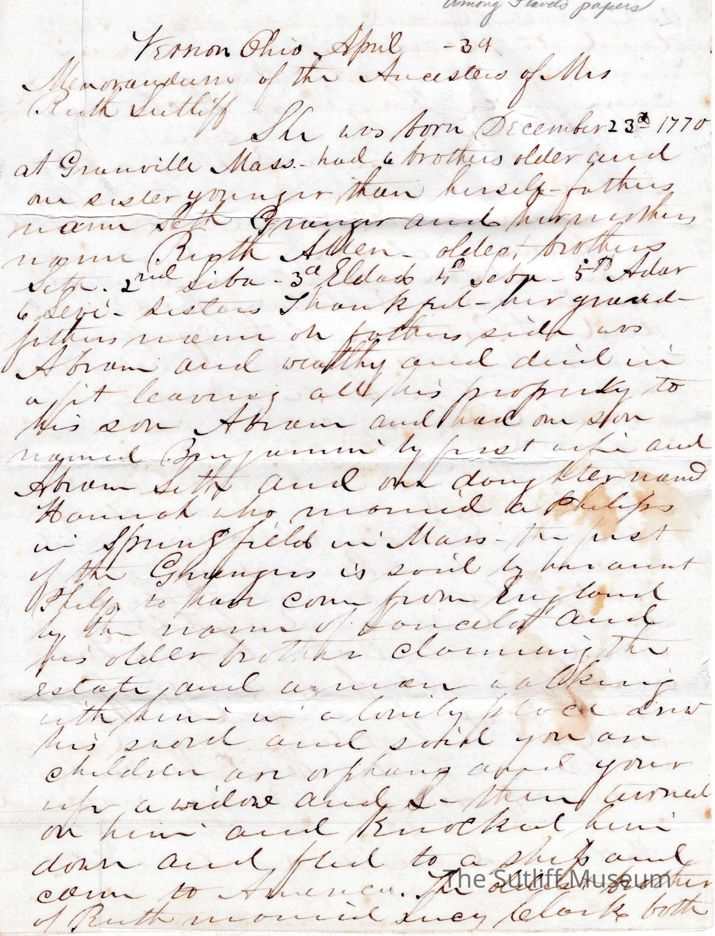 A memorandum written by Ruth Sutliff about her ancestors.Relationships