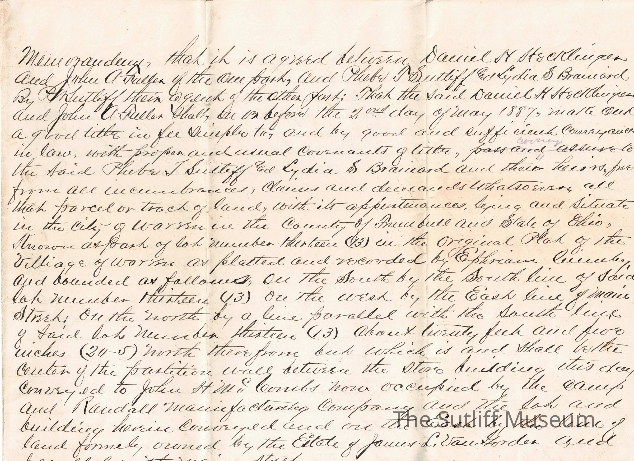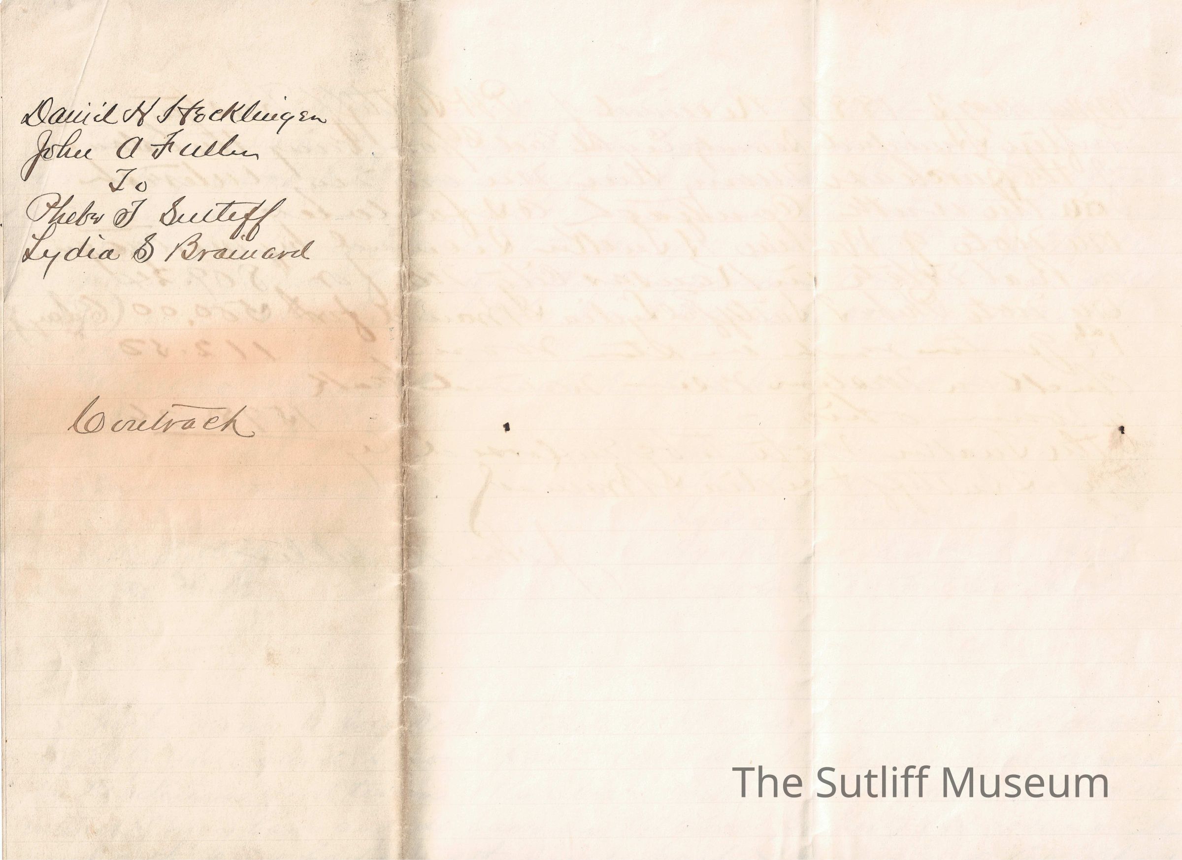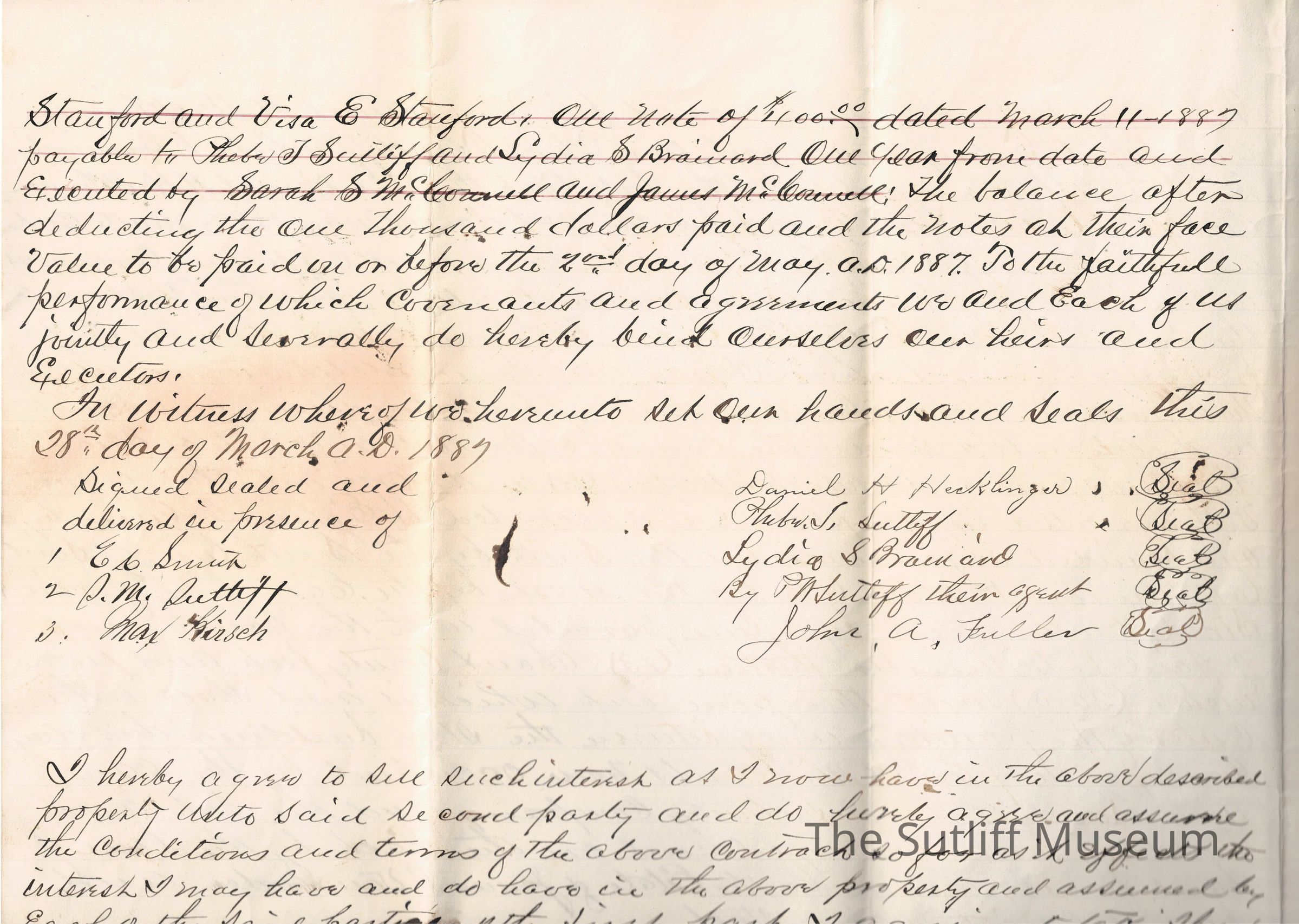A legal document acting as a contract between David H. Hecklinger and John A. Fuller to Phebe Temperance Sutliff and Lydia Sutliff Brainard.