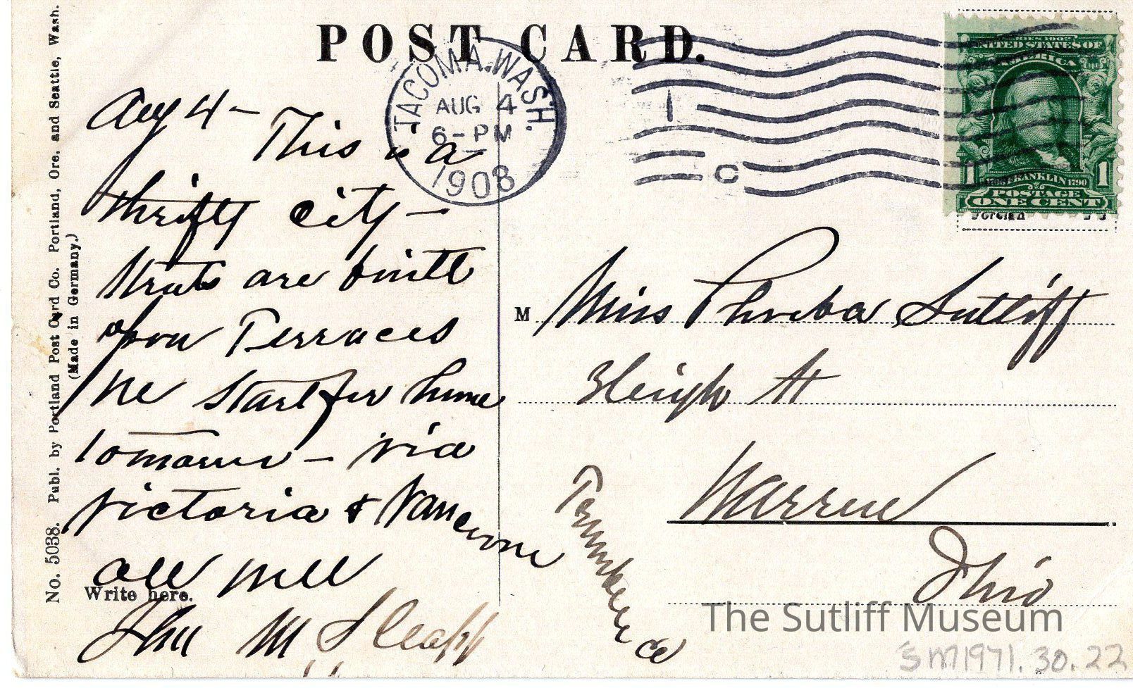 Postcard to Miss Phebe Sutliff from [?]Entry/Object ID