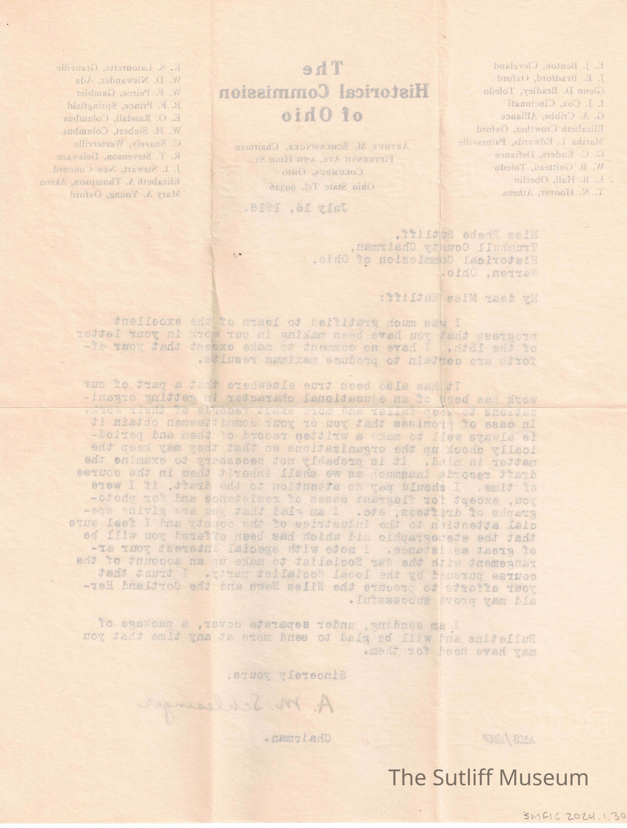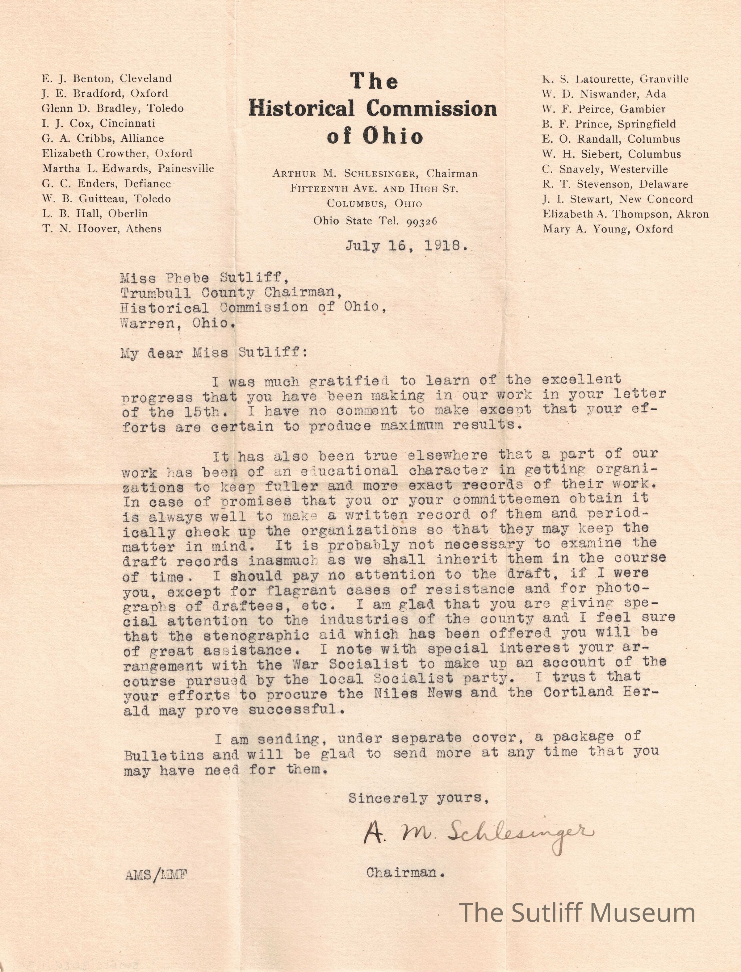 A letter from Arthur M. Schlesinger, the chairman of the Historical Commission of Ohio, to Phebe T Sutliff regarding organizations beginning to keep better records of their work.Relationships