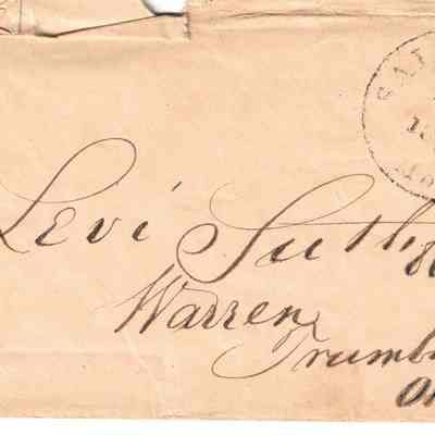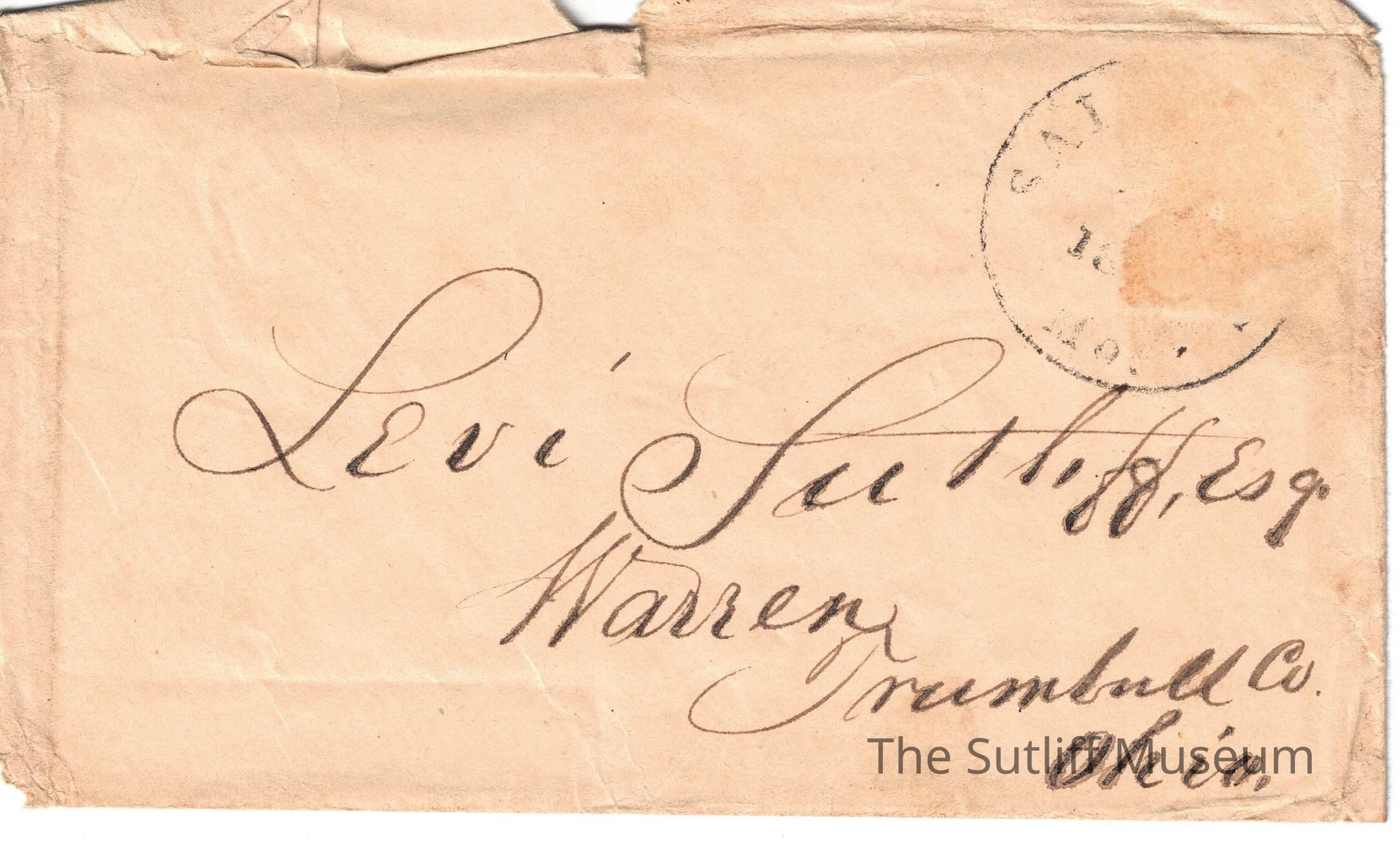 An envelope addressed to Levi Sutliff in Warren, Trumbull County Ohio, the date on the stamp is unreadable.Relationships