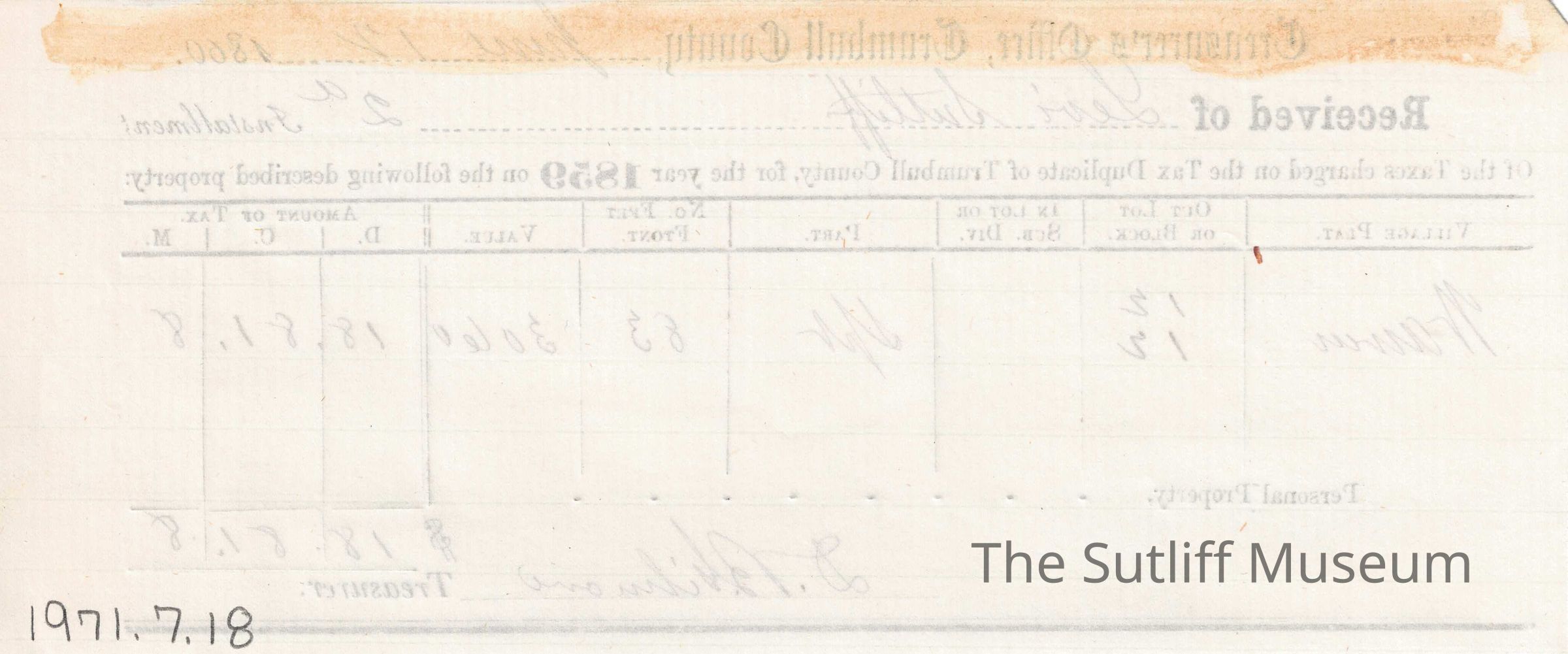 A small sheet listing Levi Sutliff's taxes for the 1859 year.Relationships