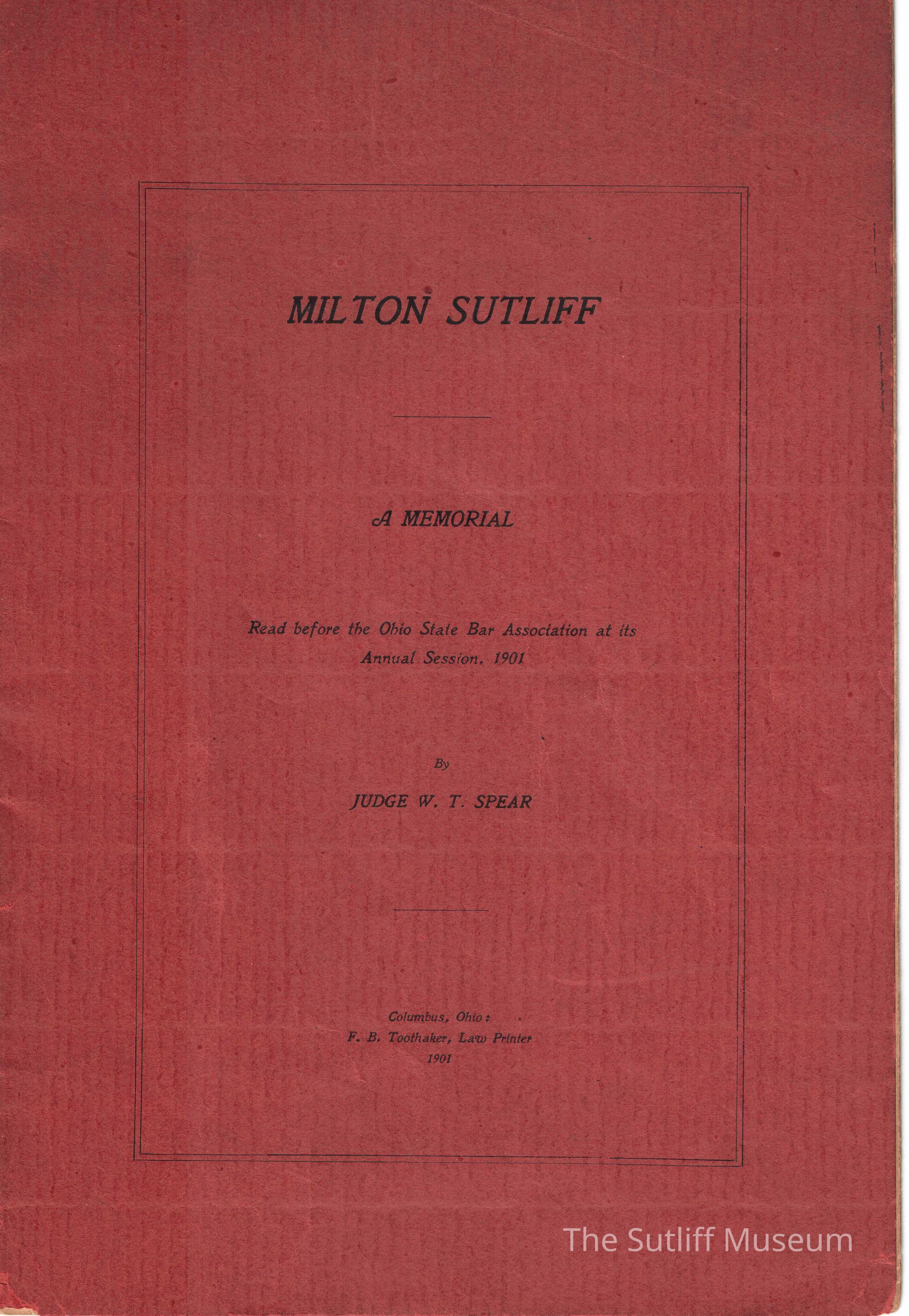 A memorial for Milton Sutliff read by Judge W.T. Spear at the 1901 Annual Meeting of the State Bar Association of Ohio describing his life and importance to the Bar Association.Collection