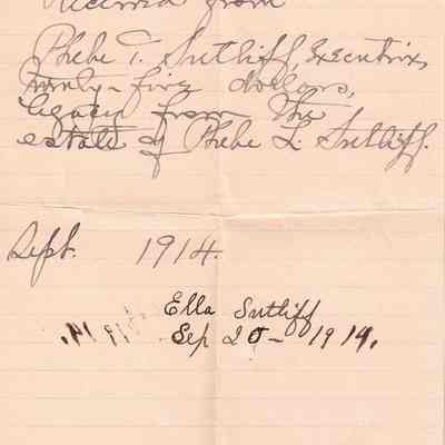 A note from Ella Sutliff to Phebe T. Sutliff that she has received her inheritance from Phebe Lord Marvin Sutliff. Associated with Phebe Lord Marvin Sutliff's death receipts.Collection