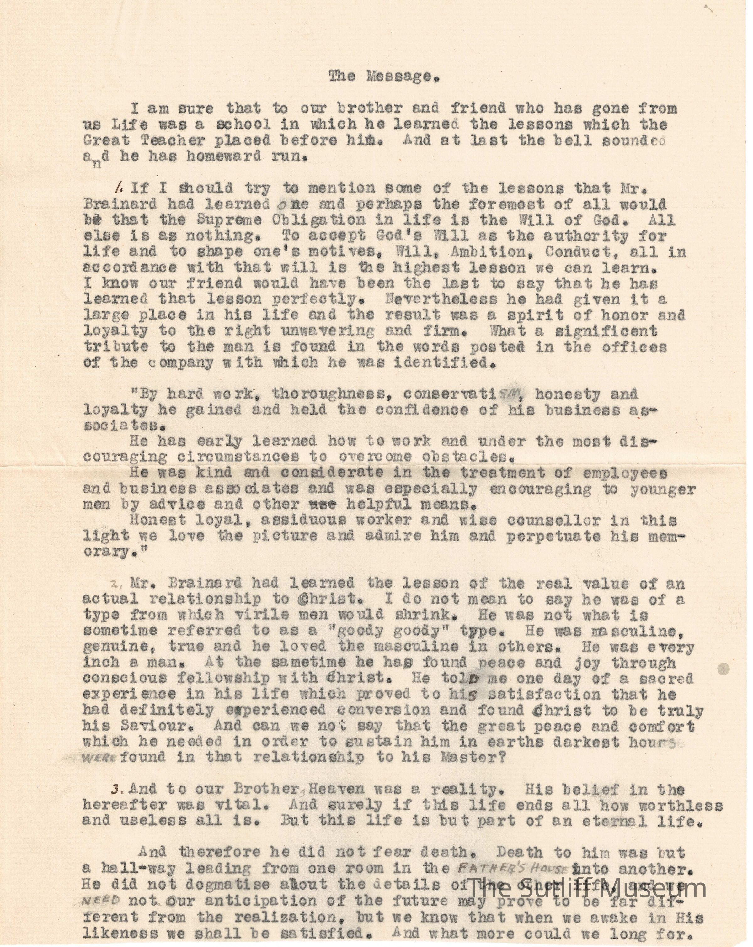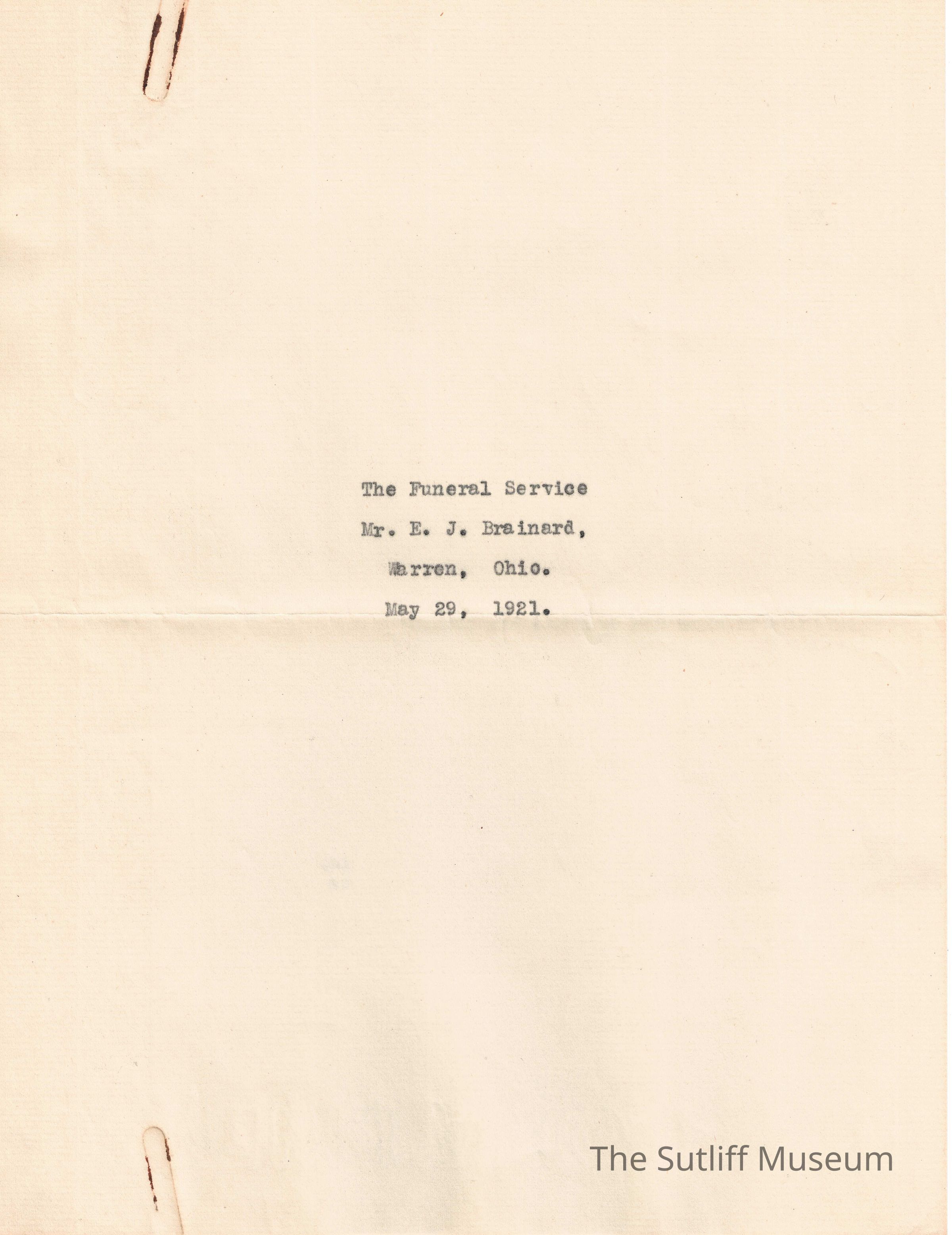 The Funeral Service papers for Edward J. Brainard, which took place on May 29, 1921.Collection