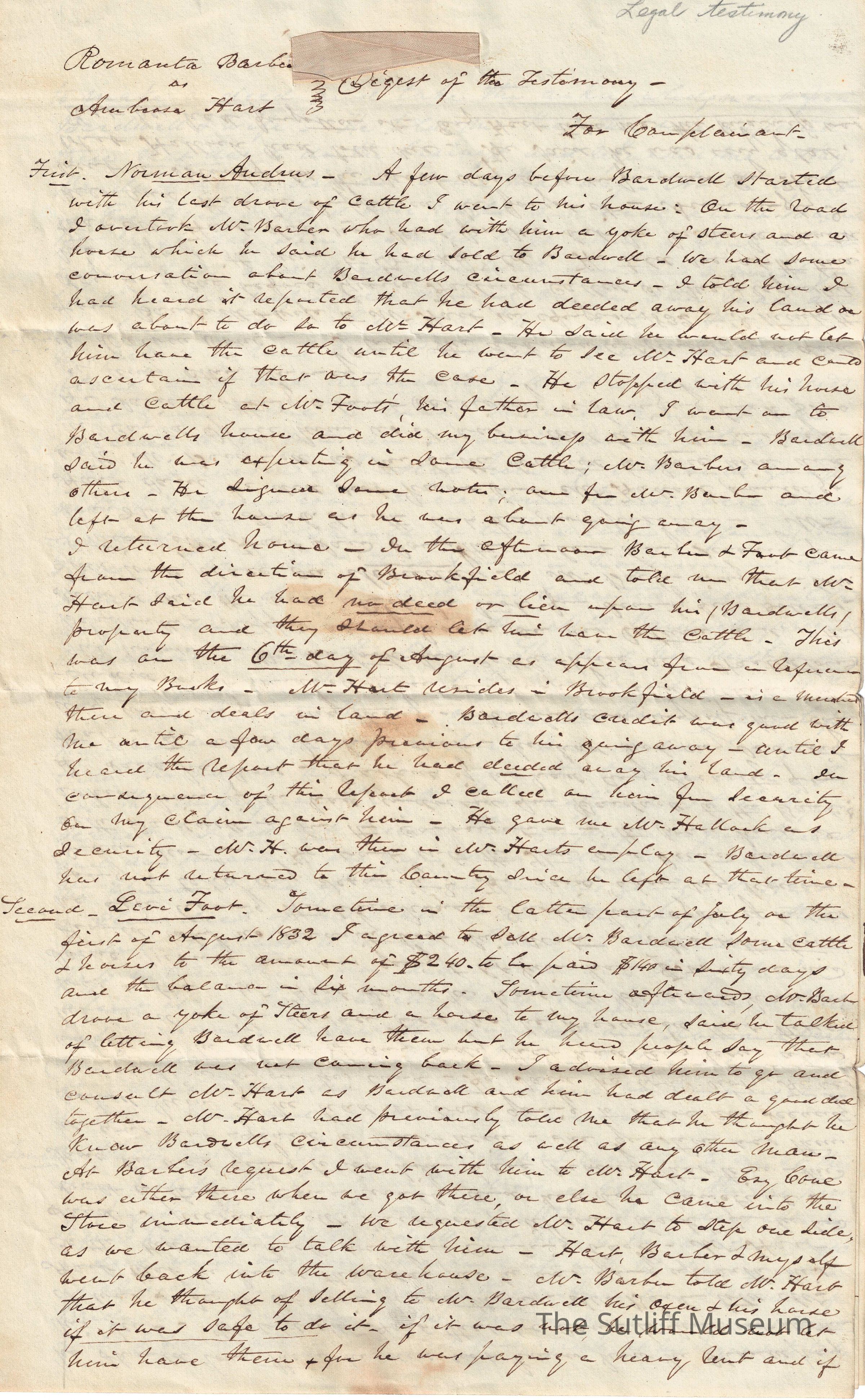 A legal testimony for the case of Romanta Barber v. Ambrose Hank.Relationships