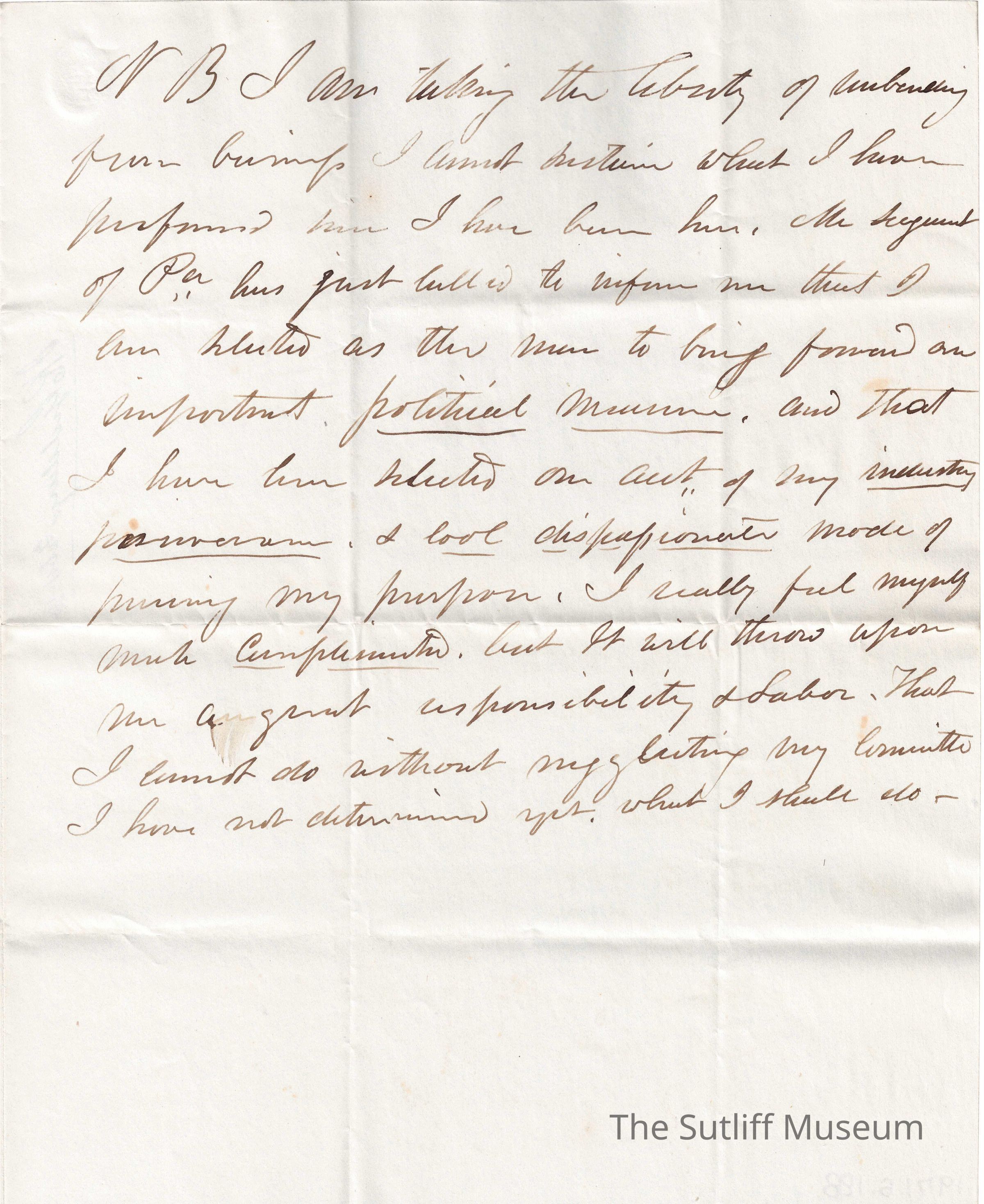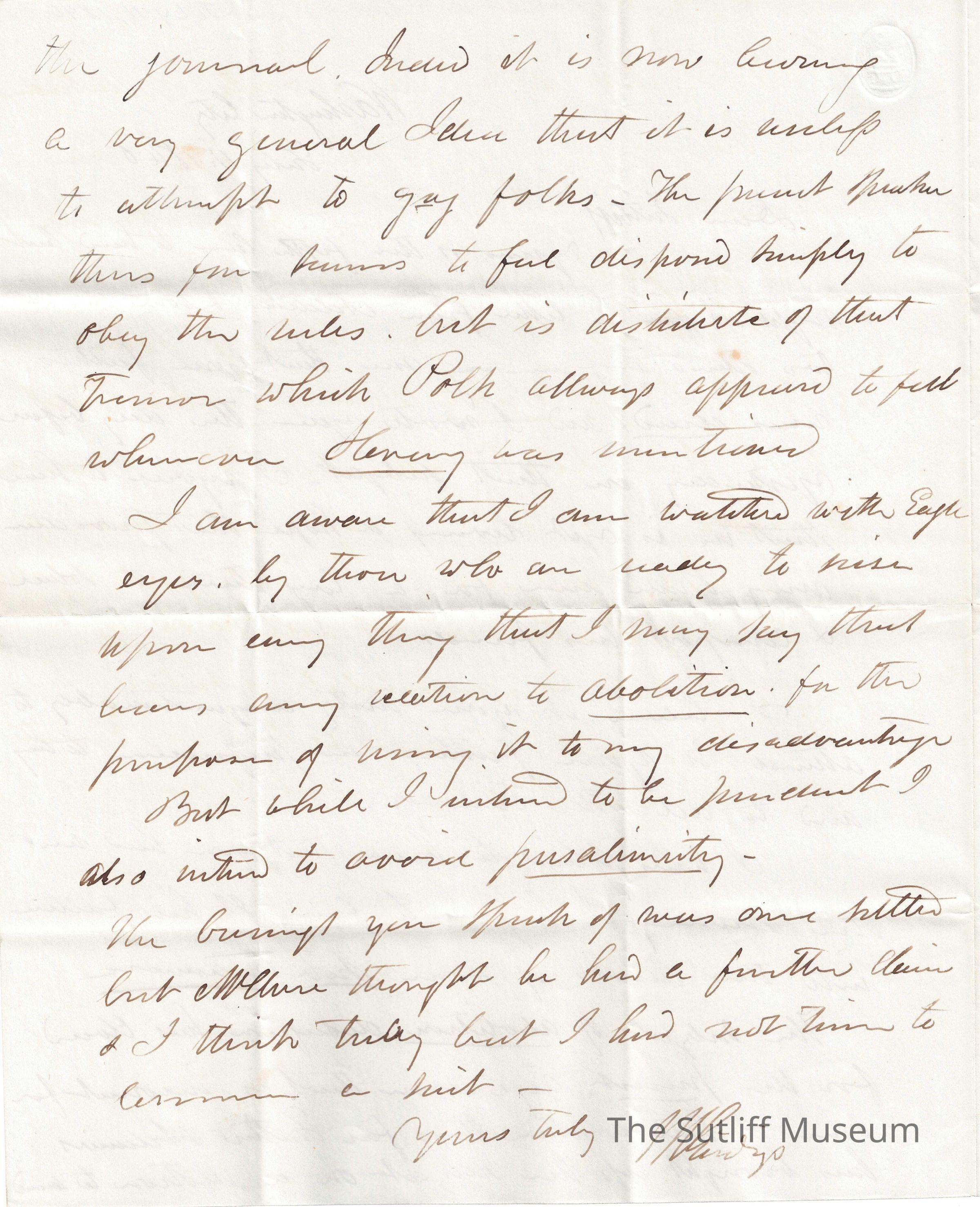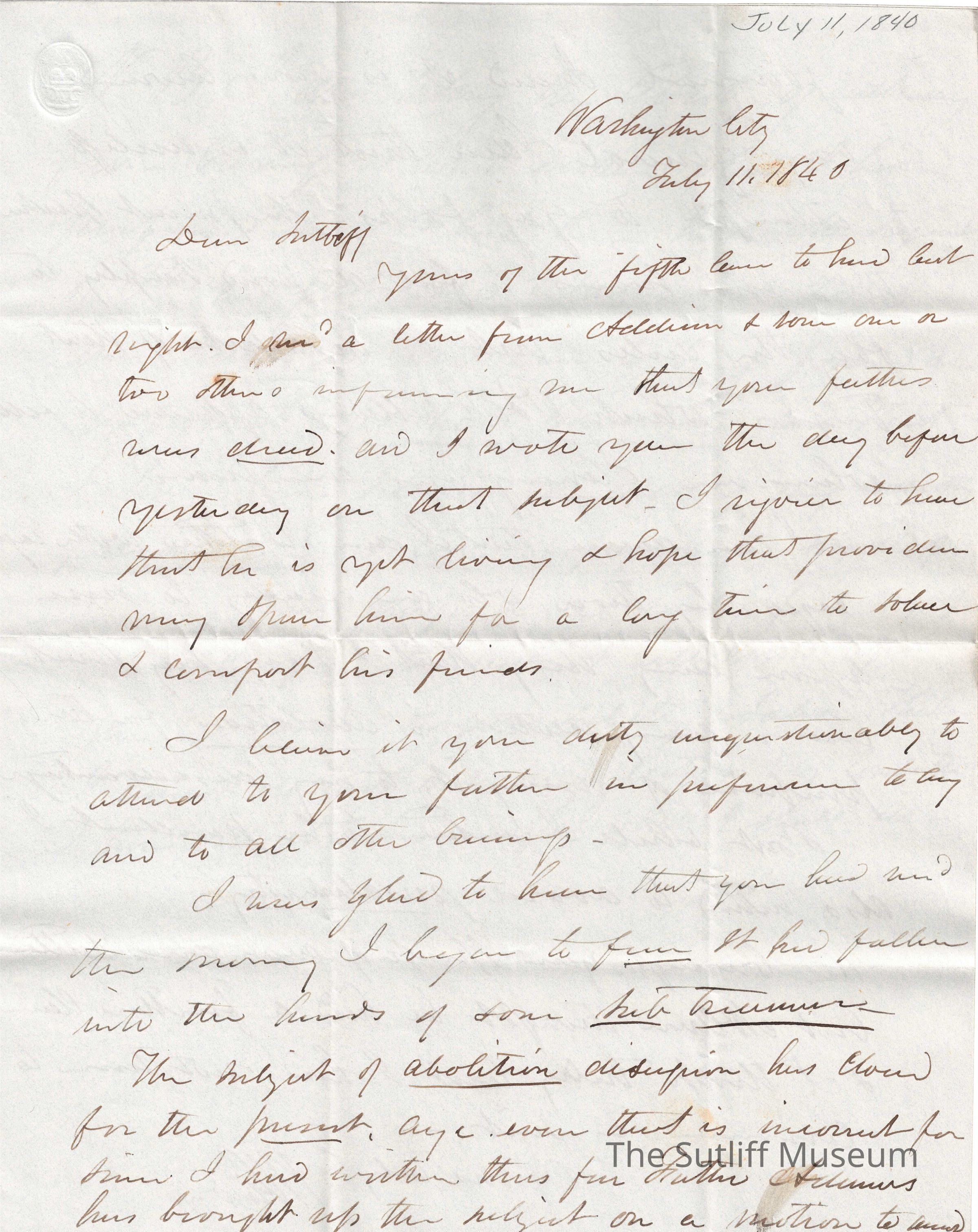 Letter from Joshua Reed Giddings to Flavel Sutliff regarding more condolences for the loss of his father and updates about abolition.Collection