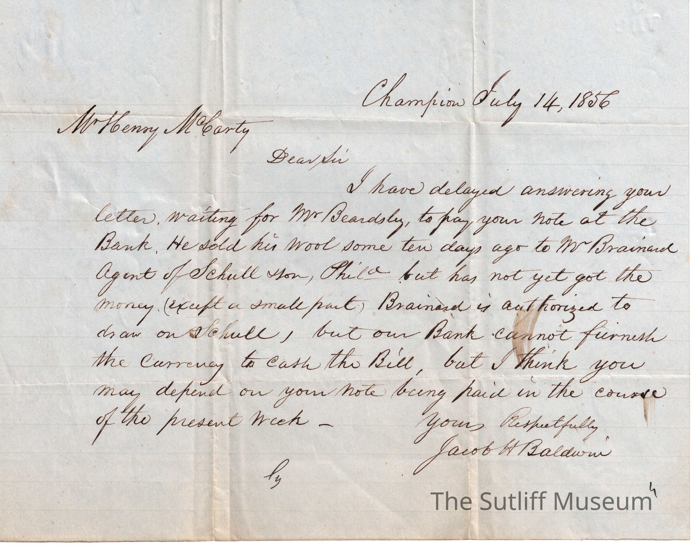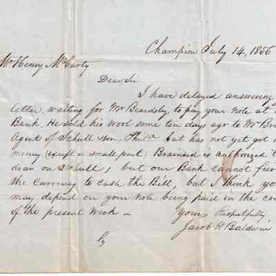 A letter from Jacob Baldwin to Henry M. Carty regarding an expected payment.Relationships