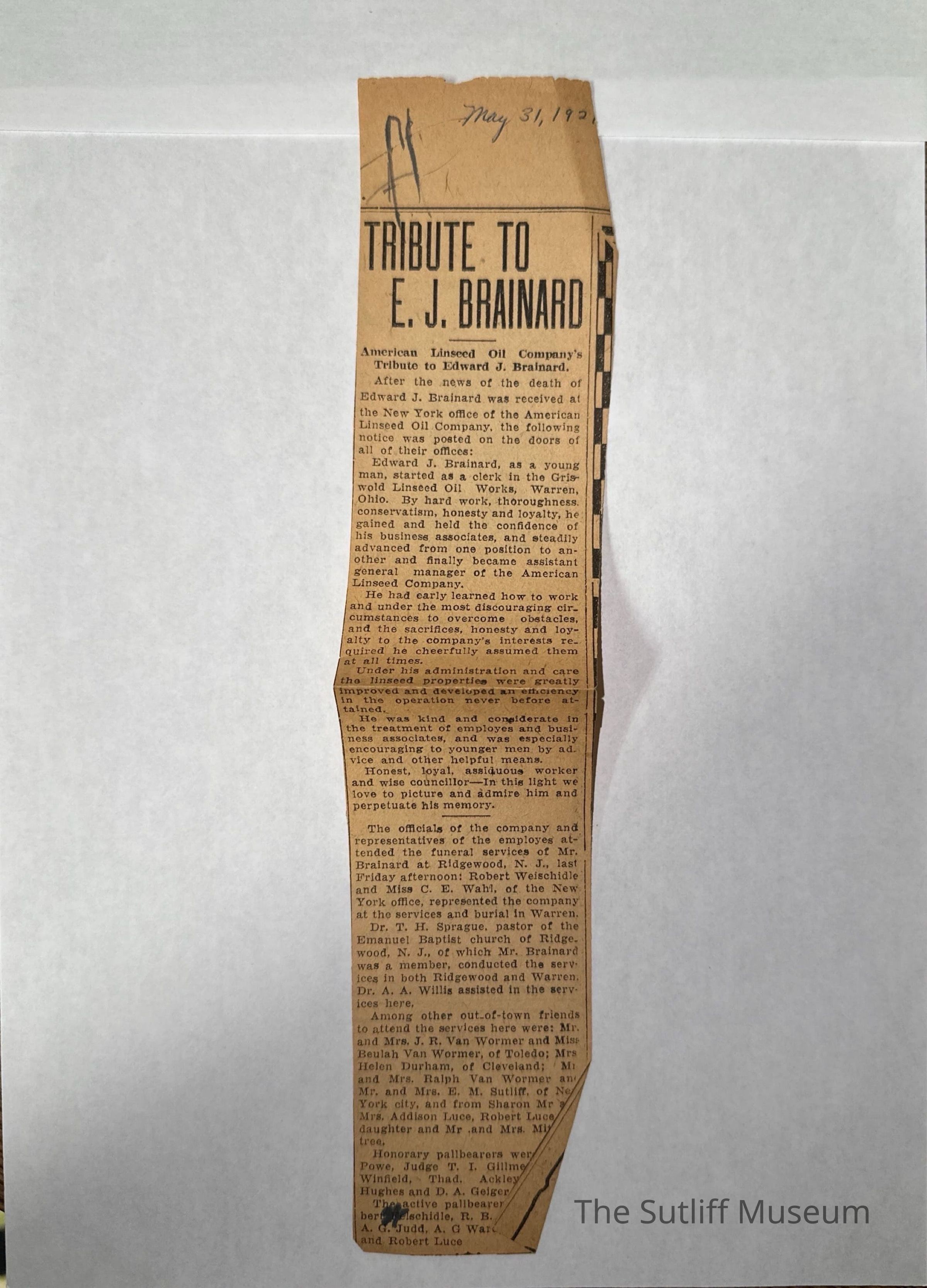 Newspaper clipping with an article titled "Tribute to E.J. Brainard" dated May 31, 1921Collection