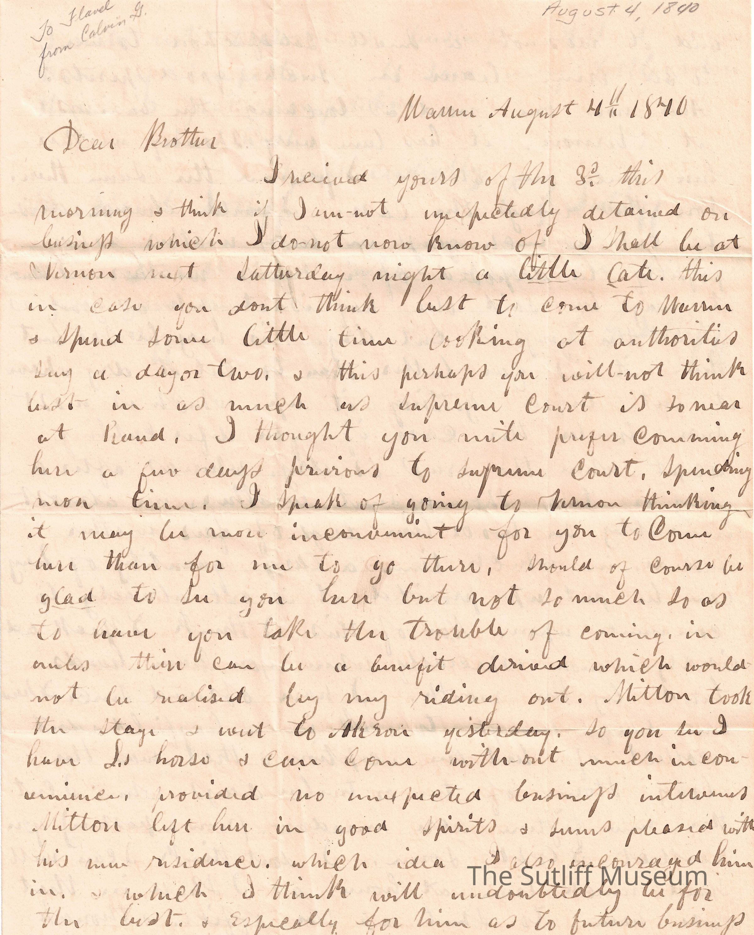 Letter from Calvin Granger Sutliff to Flavel Sutliff regarding politics, and their trips to Vernon.Collection