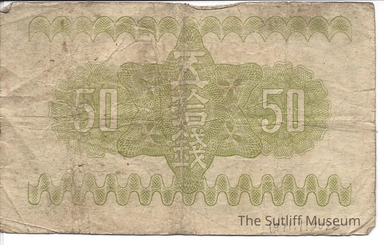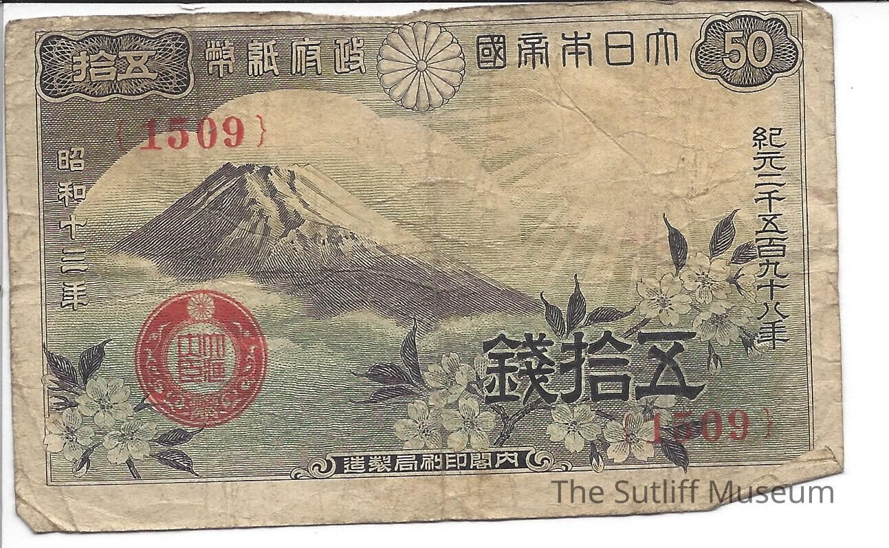 A Japanese 50 sen note. On the front is a picture of florals and a mountain along with the number 1509, the back has a detailed design in green ink and the value of the currencyCollection