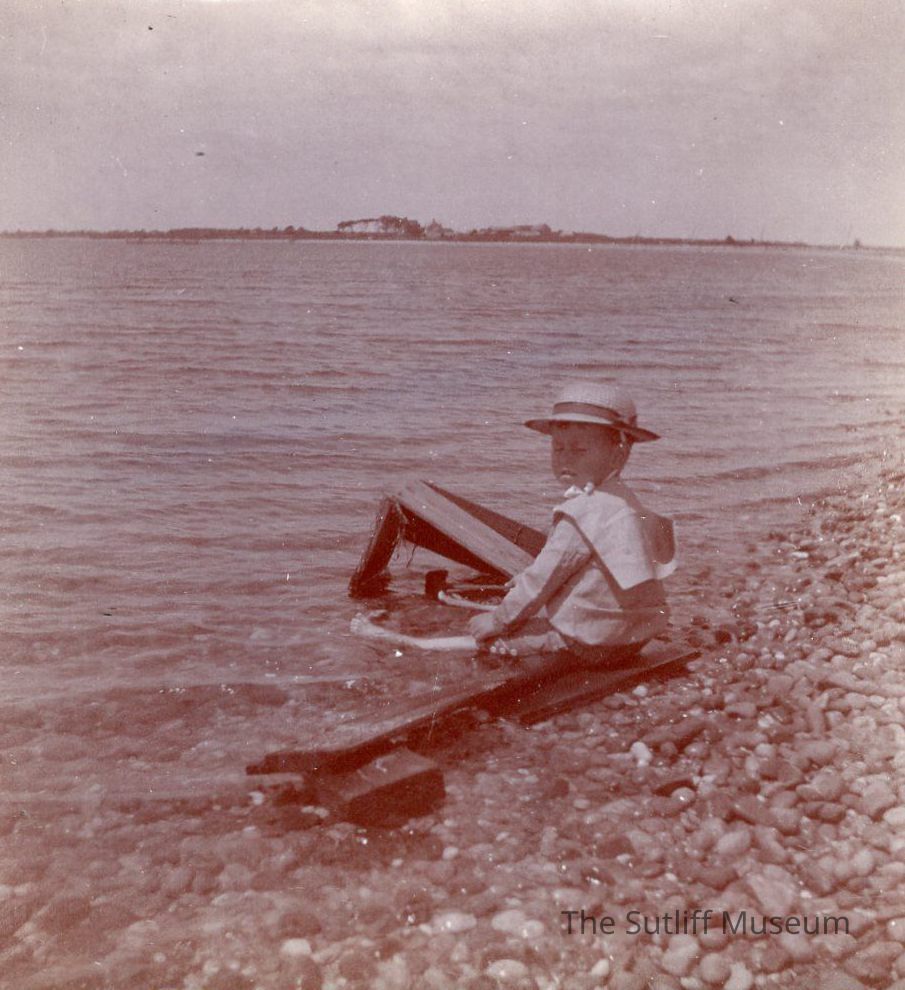 Photo of Edward Sutliff Brainard as a child playing in the water on the shore of a lake or ocean. He is wearing a round sunhat and is captured with his eyes closed. Photo is dated approximately around 1899-1900.Relationships