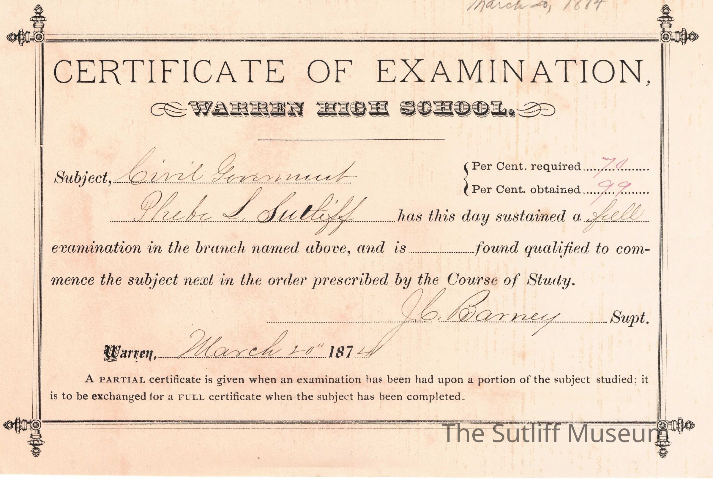 Certificate of Examination for Phebe T. Sutliff, for Civil Government at Warren High SchoolArchive Details